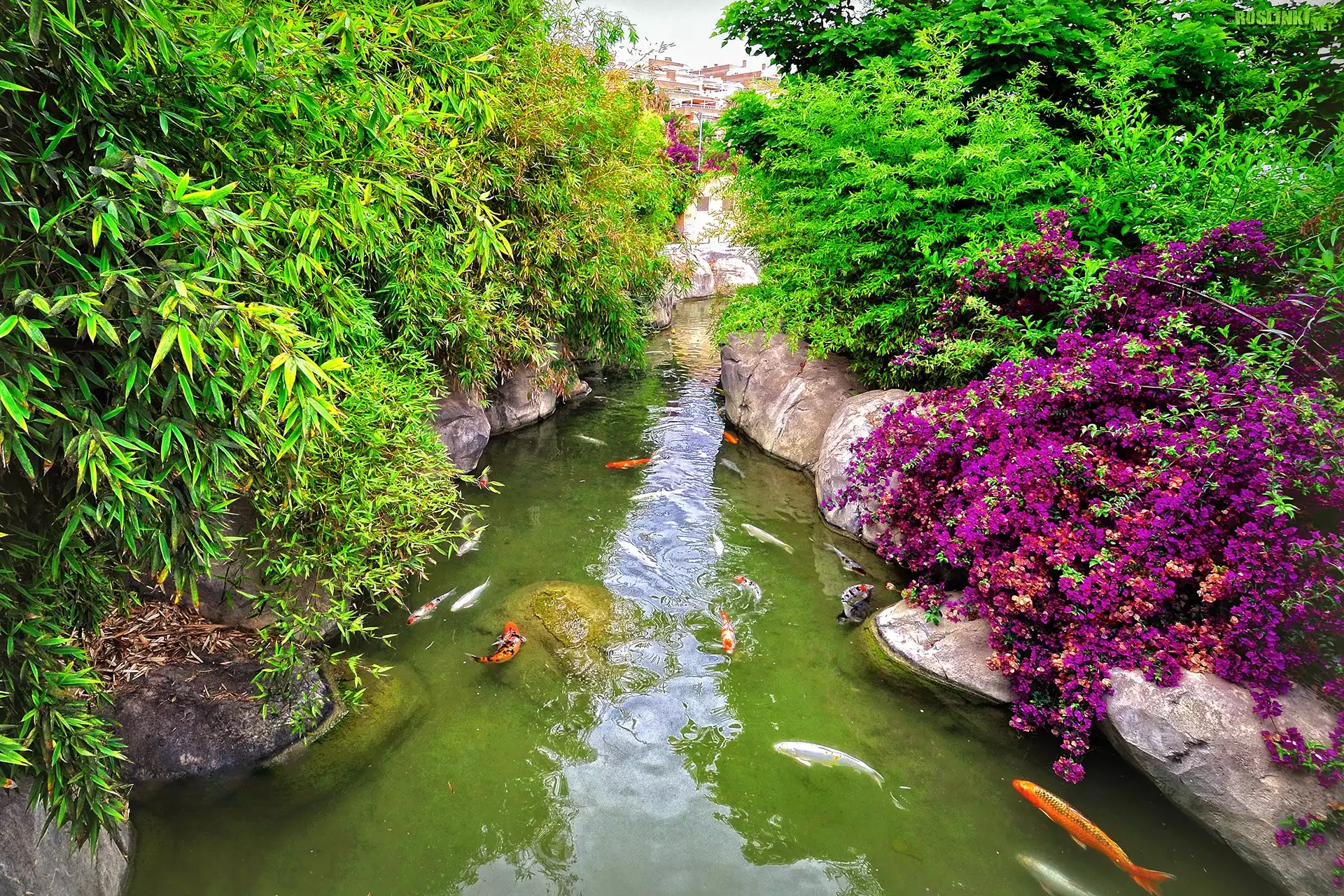 Rośliny: Potok, Ryby, Skały, Krzewy, Kwiaty