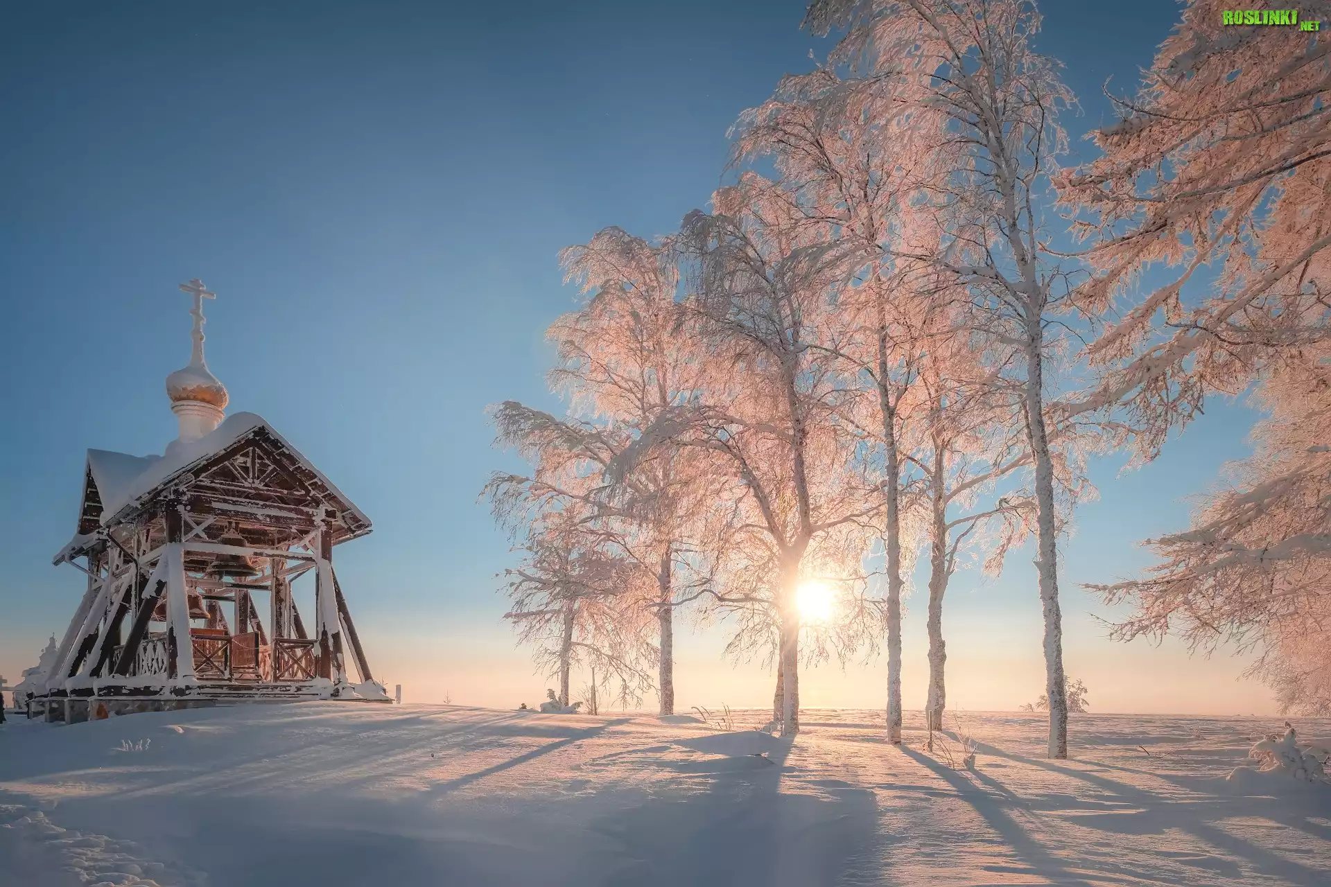 Rośliny: Zima, Drzewa, Promienie słońca, Drewniana, Dzwonnica, Biała Góra, Kraj Permski, Rosja