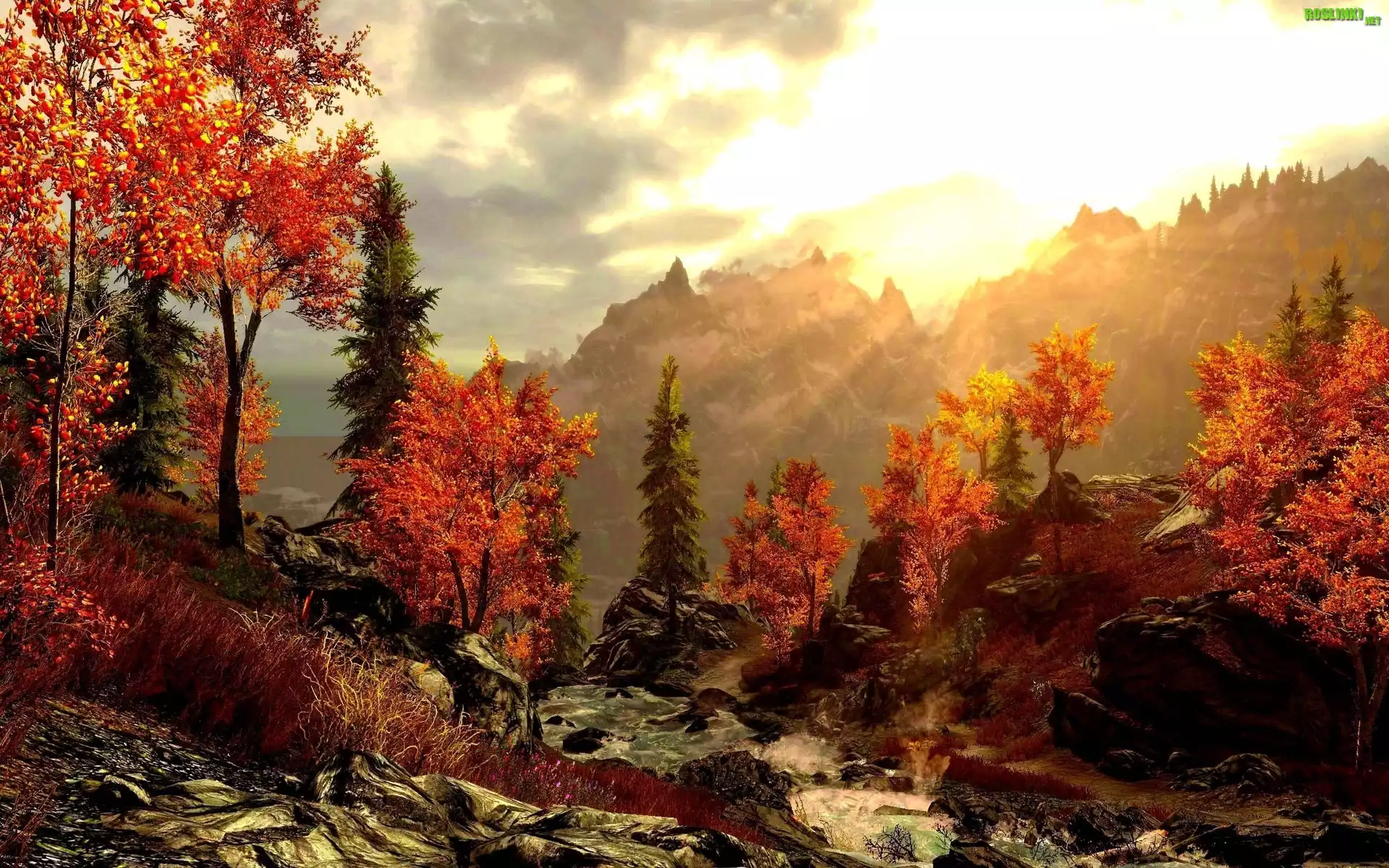 Rośliny: Promienie, Słońca, Skały, Drzewa, Jesień