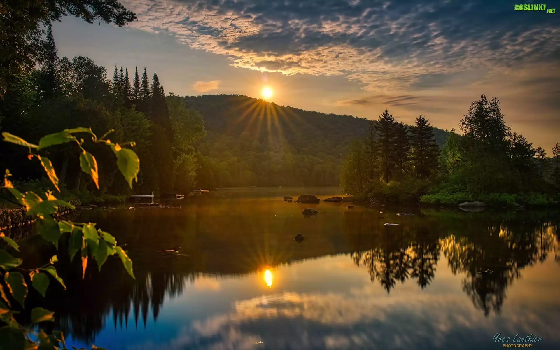Rośliny: Jezioro, Wschód słońca, Promienie, Drzewa, Góry
