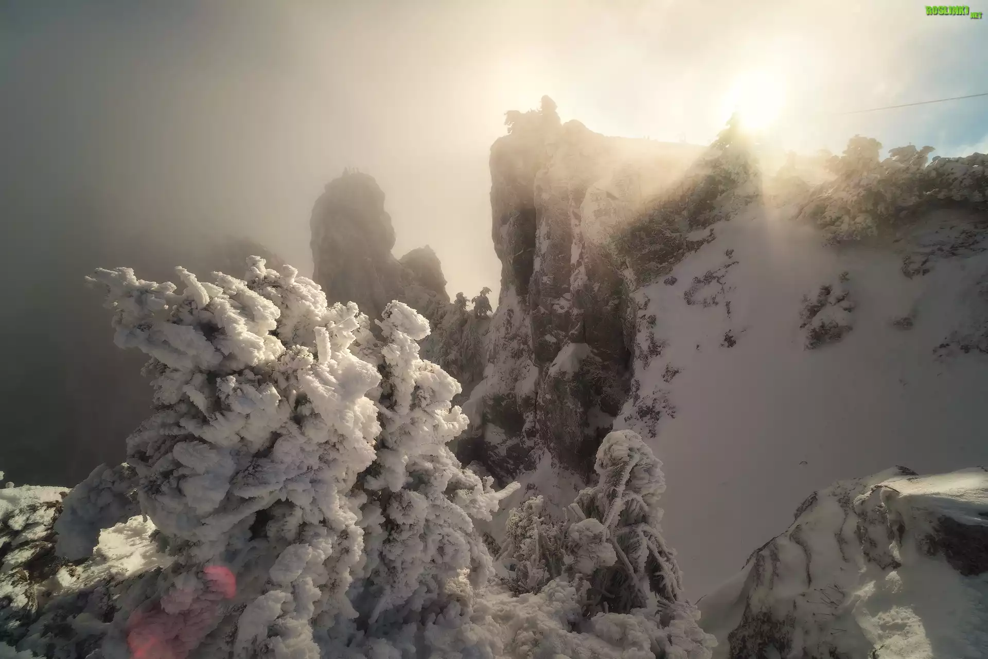 Zima, Drzewa, Promienie słońca, Góry Krymskie, Śnieg, Szczyt Aj-Petri, Krym