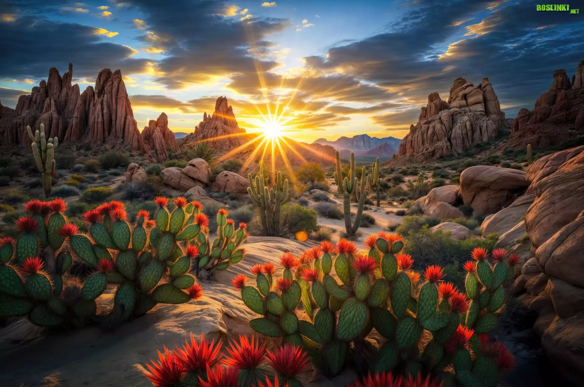 Rośliny: Kaktusy, Pustynia, Skały, Promienie słońca, Grafika