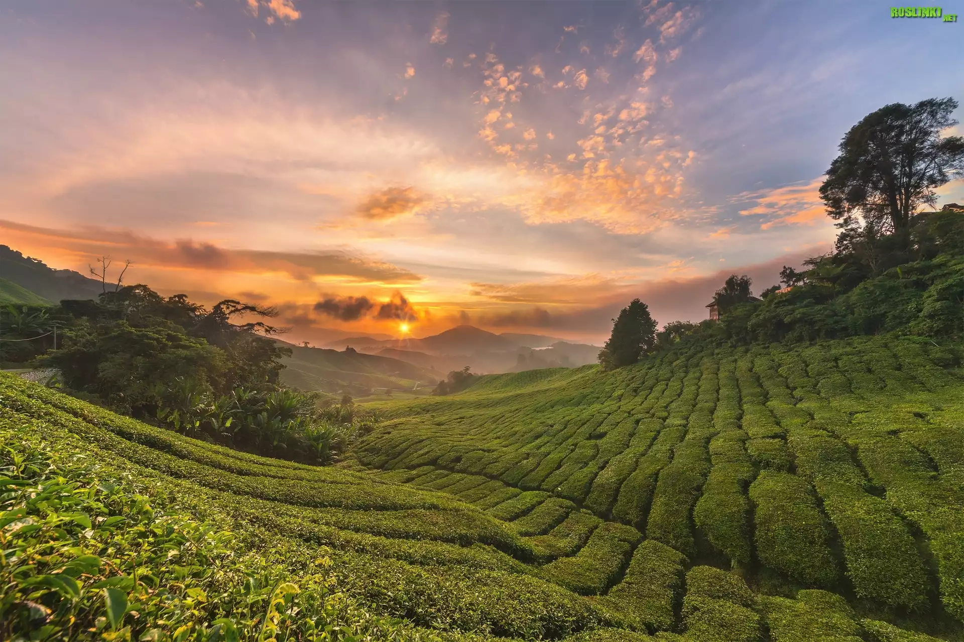 Plantacja, Wzgórza, Drzewa, Krzewy, Chmury, Promienie słońca, Cameron Highlands, Stan Pahang, Malezja |