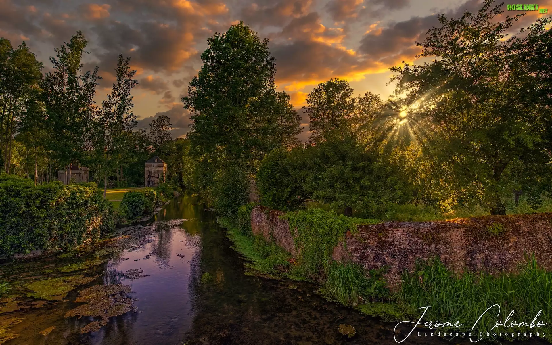 Rzeka, Promienie słońca, Chmury, Mur kamienny, Drzewa, Roślinność