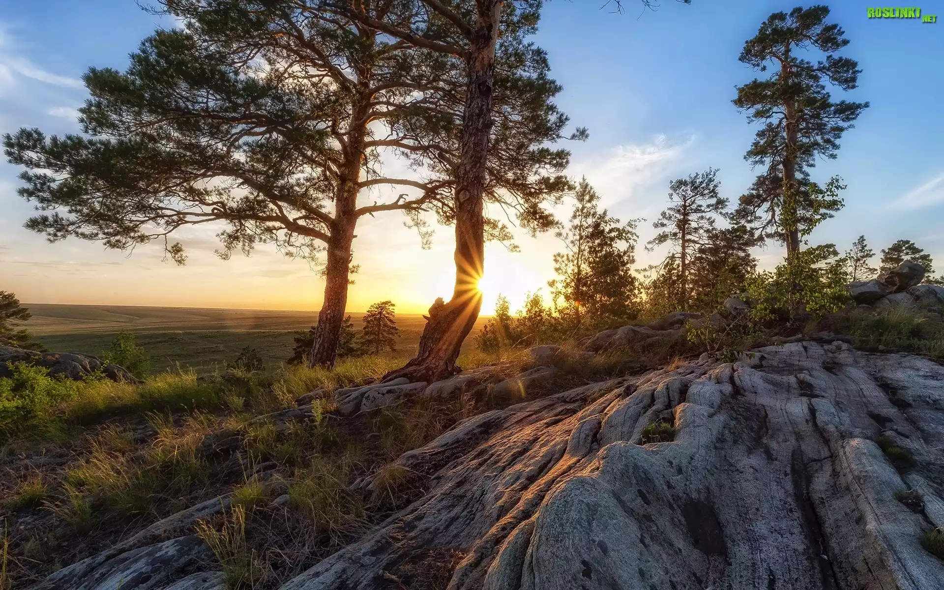 Rośliny: Promienie słońca, Sosny, Drzewa, Skały, Trawa