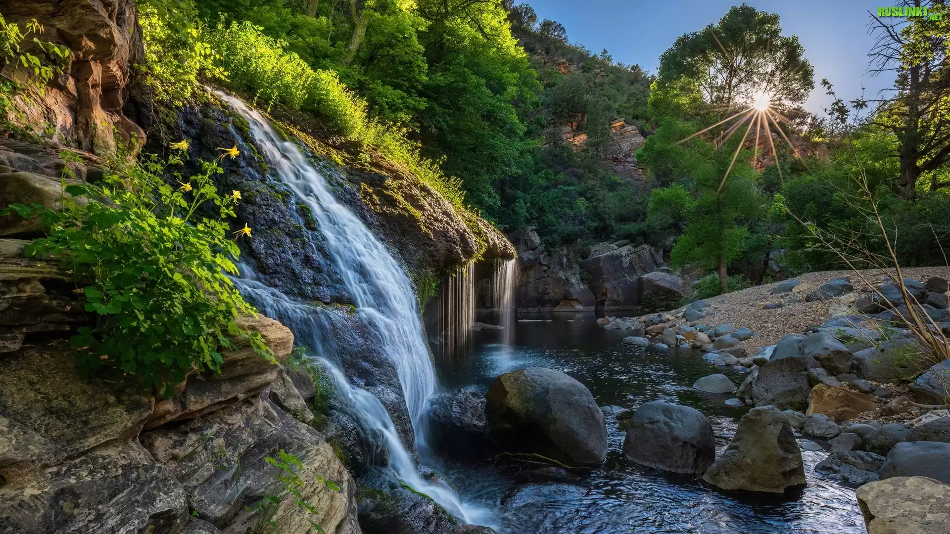 Rośliny: Rzeka, Wodospad, Skały, Promienie słońca, Drzewa, Roślinność
