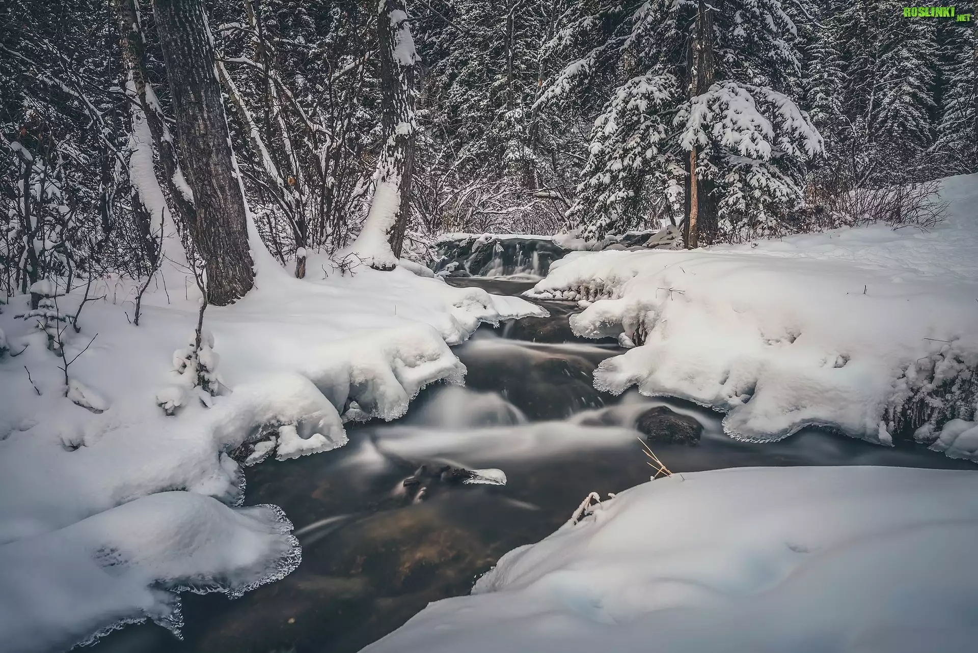 Kanada, Prowincja Alberta, Park Prowincjonalny Big Hill Springs, Las, Strumień, Zima, Śnieg, Drzewa, Rzeka |