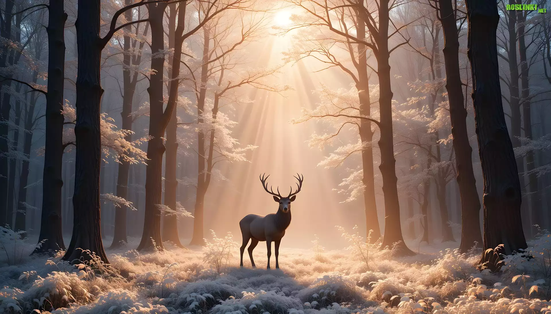 Rośliny: Zima, Jeleń, Las, Przebijające światło, Drzewa