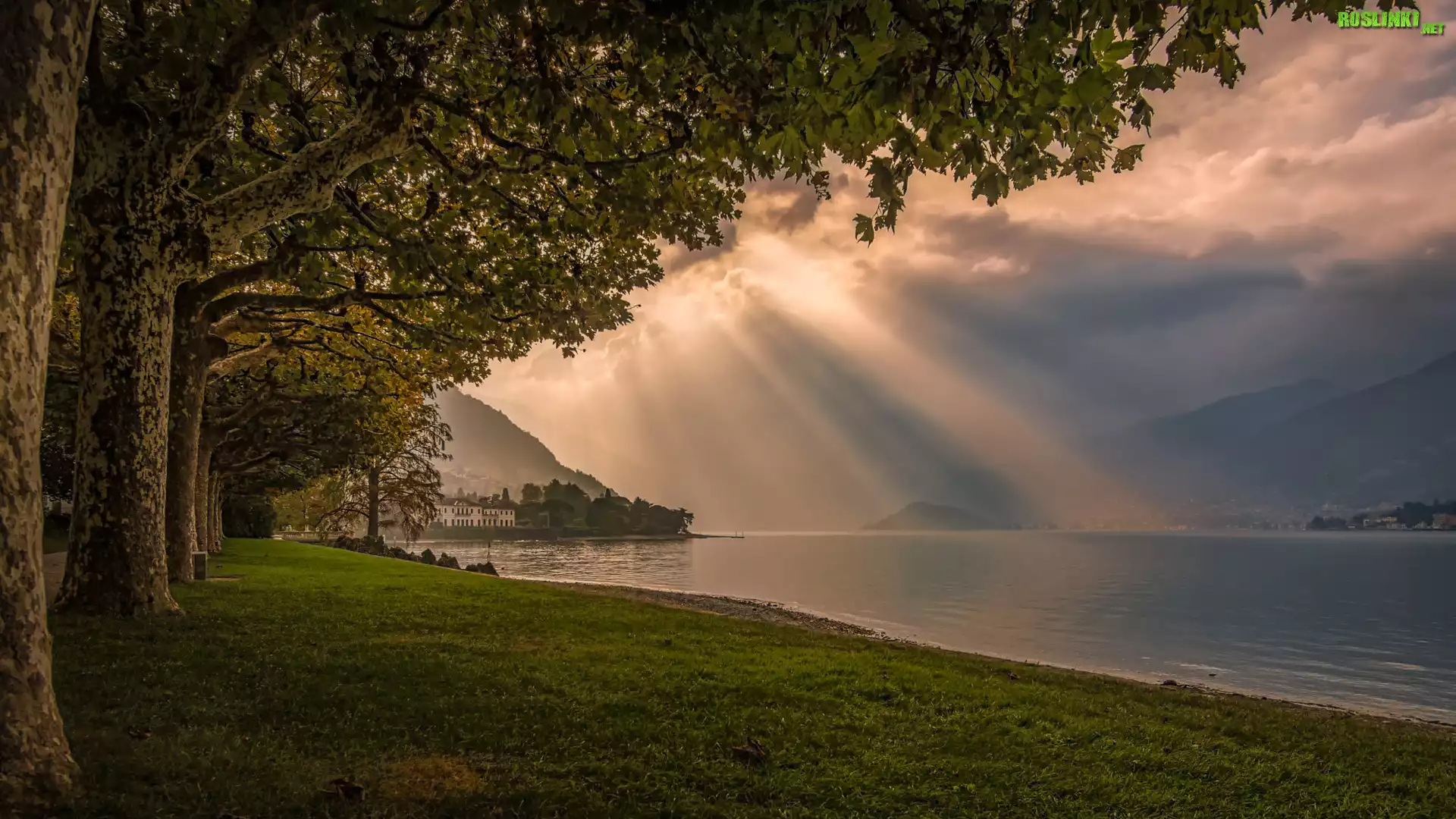 Jezioro Como, Góry, Drzewa, Domy, Przebijające światło, Ogród Villa Melzi, Bellagio, Włochy