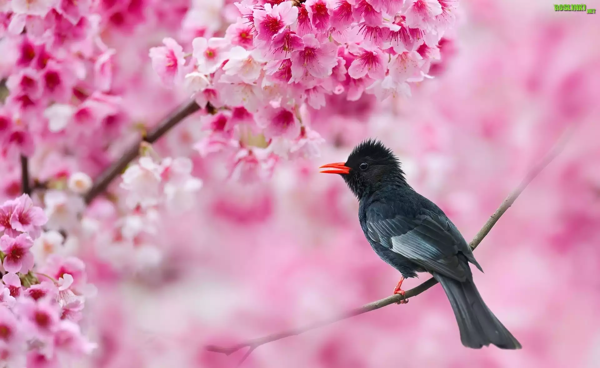 Czarny, Ptak, Szczeciak granatowy, Kwiaty, Drzewo, Owocowe
