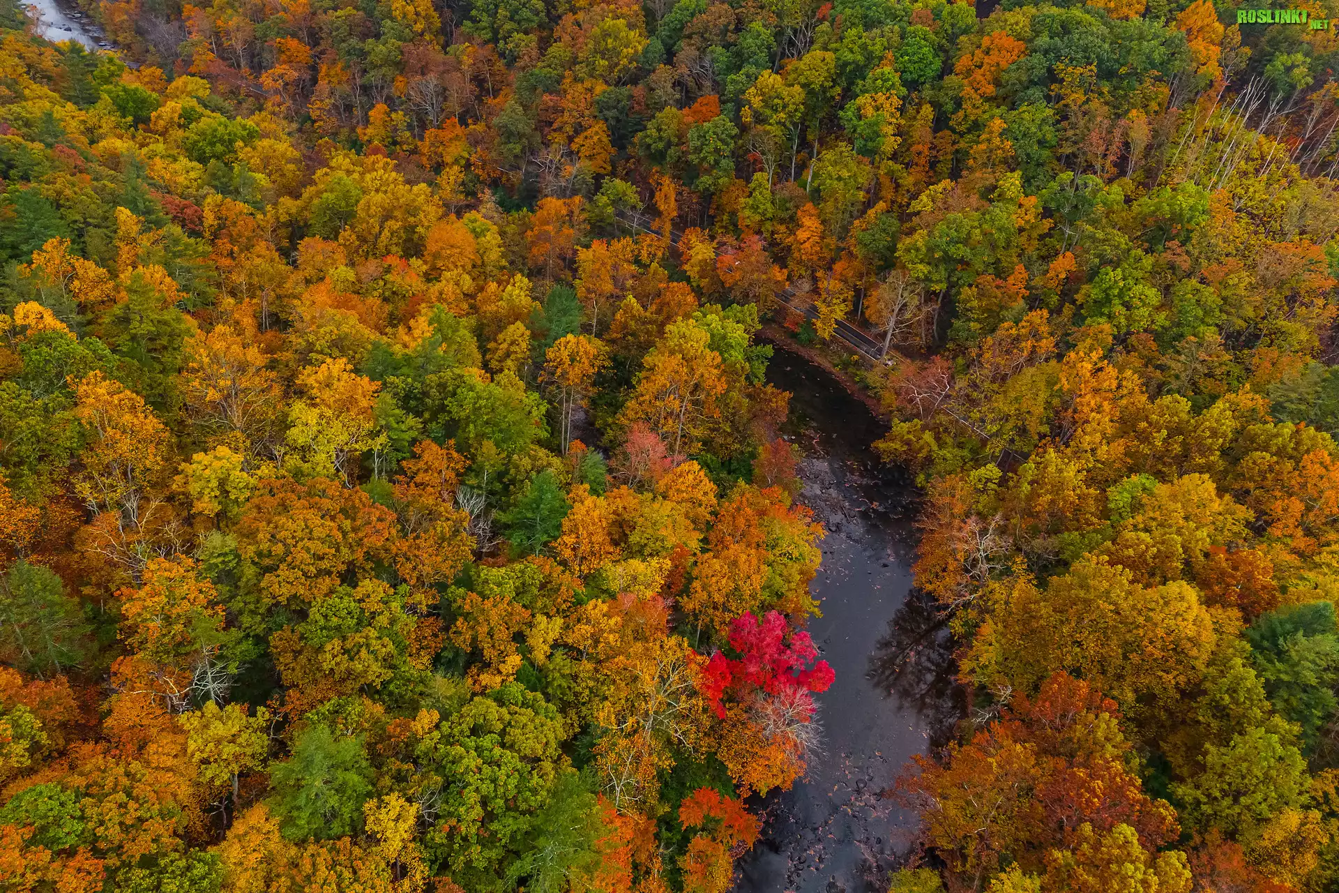 Rośliny: Jesień, Las, Kolorowe, Drzewa, Rzeka, Z lotu ptaka