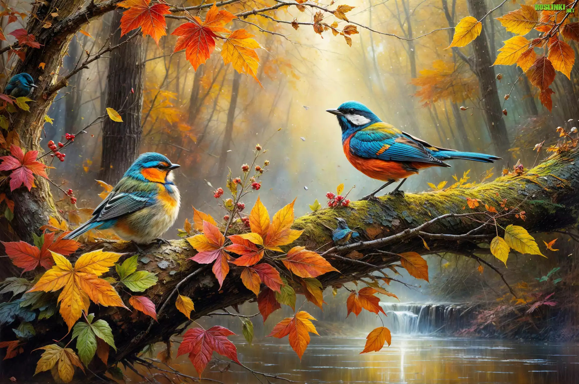 Ptaki, Kolorowe, Gałąź, Pożółkłe, Liście, Las, Rzeka, Jesień, Grafika