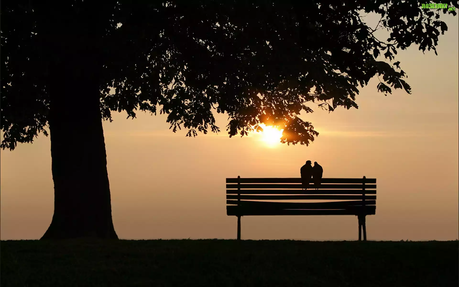 Rośliny: Ptaki, Gołębie, Ławka, Drzewo, Zachód słońca