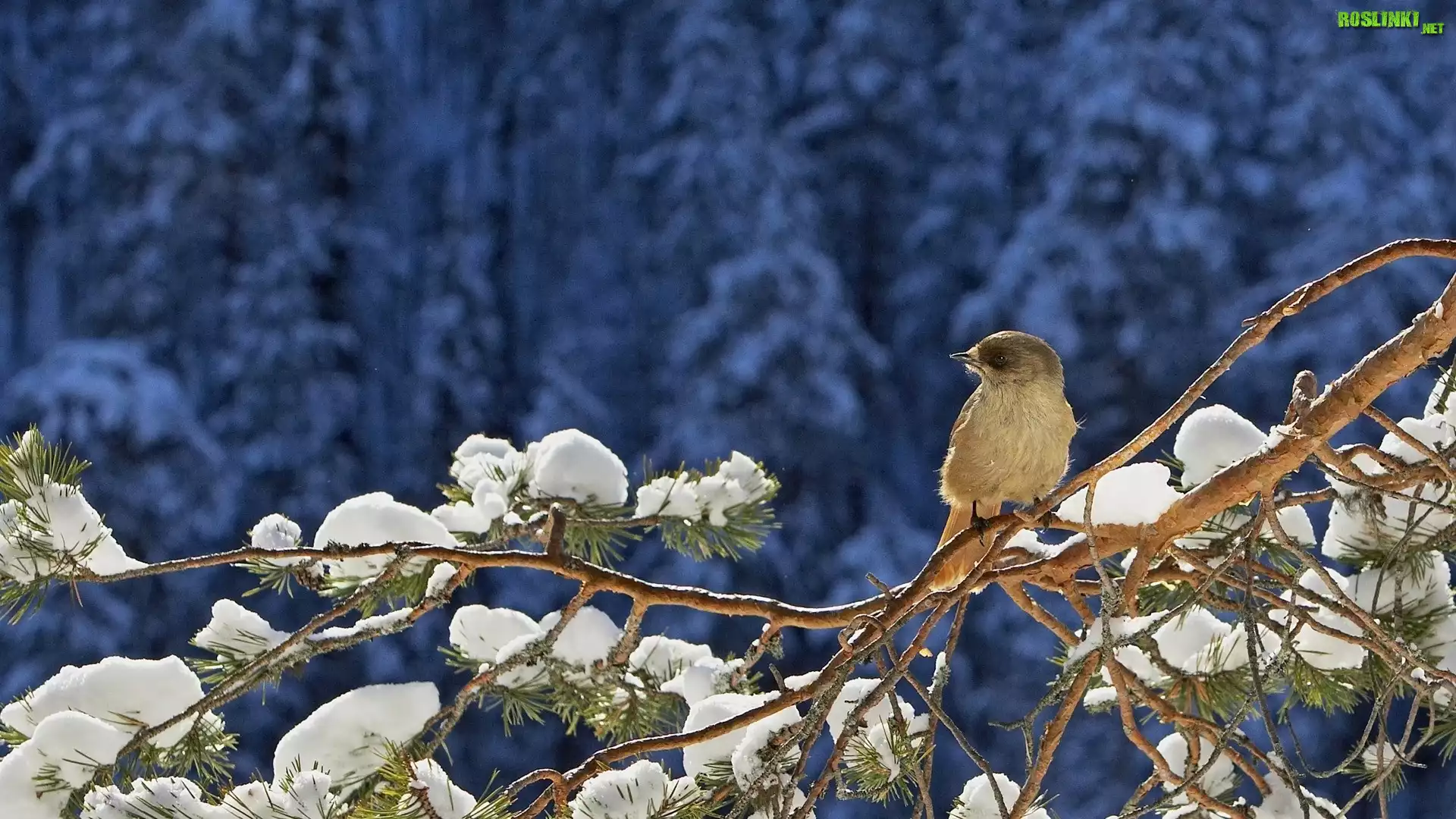 Rośliny: Ptaszek, Zima, Gałązka, Iglaka, Śnieg