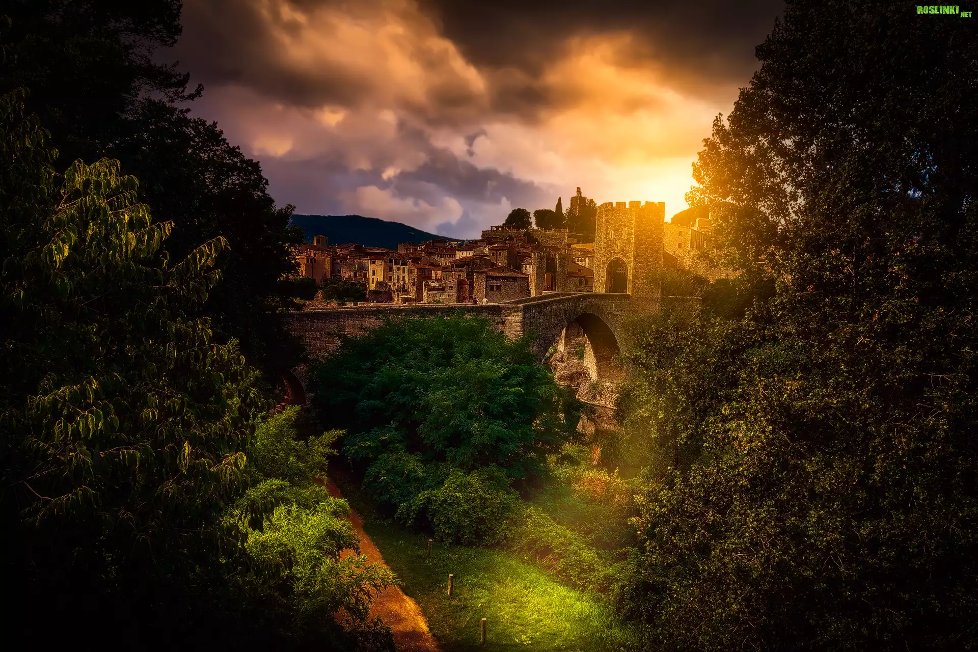 Hiszpania, Miejscowość Besalu, Most Puente de Besalu, Domy, Wzgórza, Drzewa, Roślinność, Wschód słońca, Chmury |