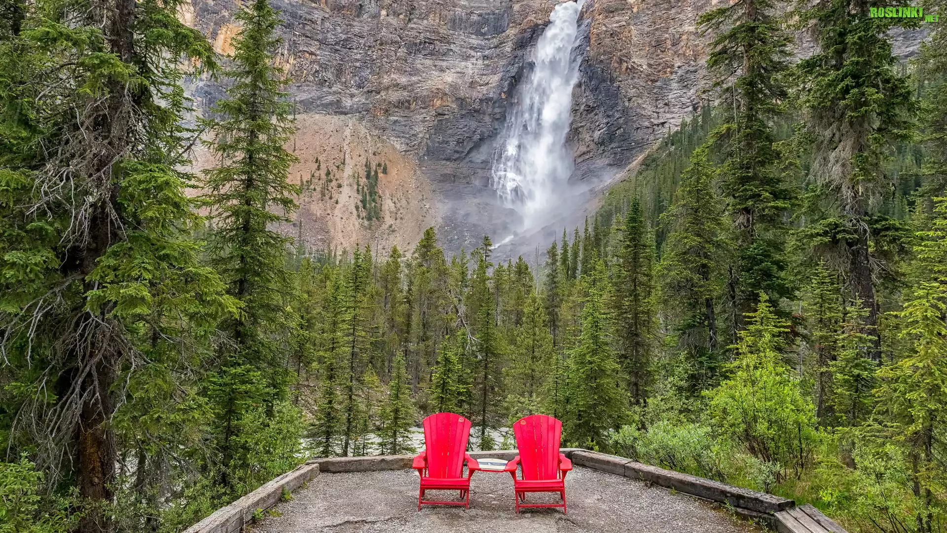 Punkt widokowy, Taras, Czerwone, Dwa, Krzesła, Las, Drzewa, Góra, Wodospad, Takkakaw Falls, Park Narodowy Yoho, Prowincja Kolumbia Brytyjska, Kanada |