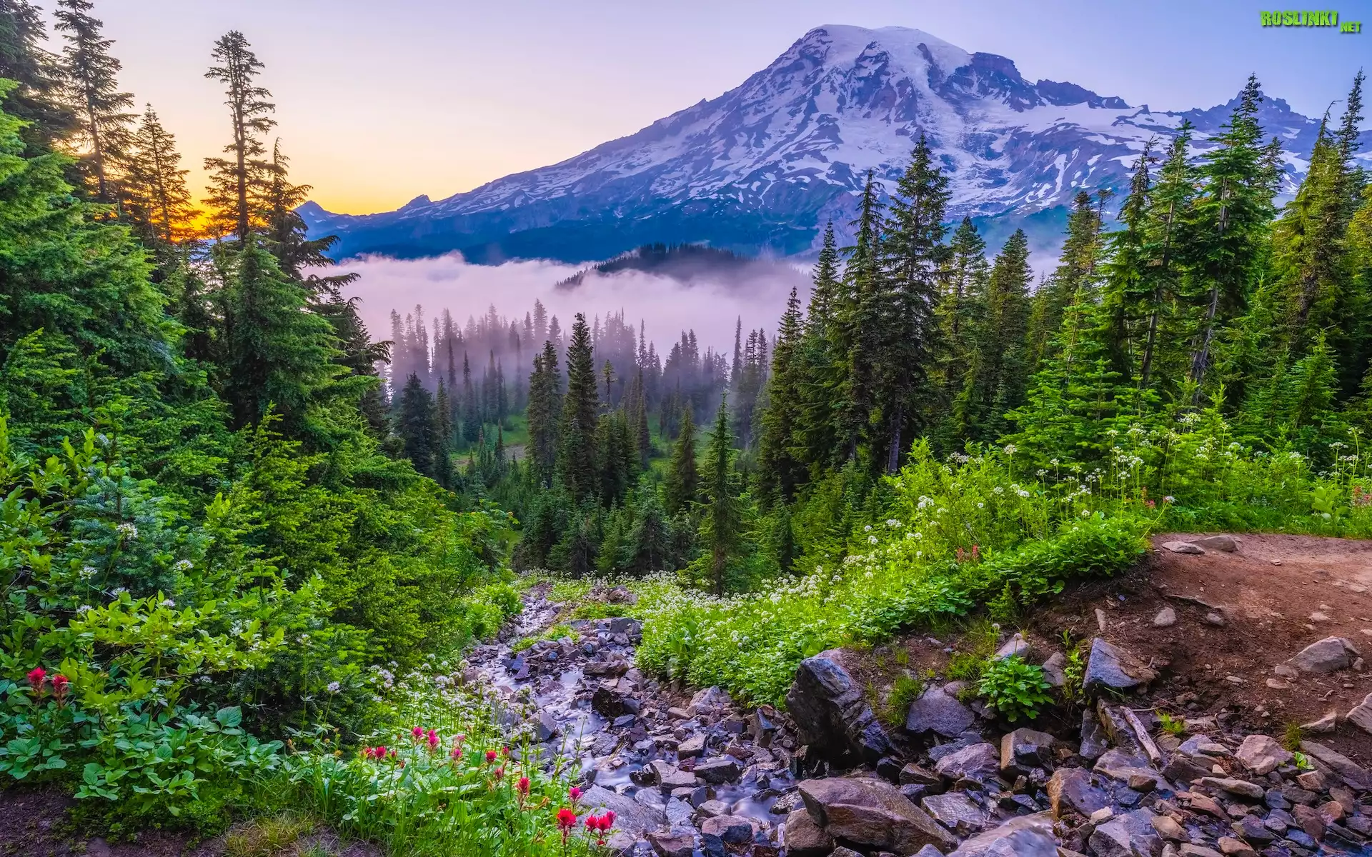 Rośliny: Stany Zjednoczone, Waszyngton, Park Narodowy Mount Rainier, Góra, Mount Rainier, Mgła, Drzewa