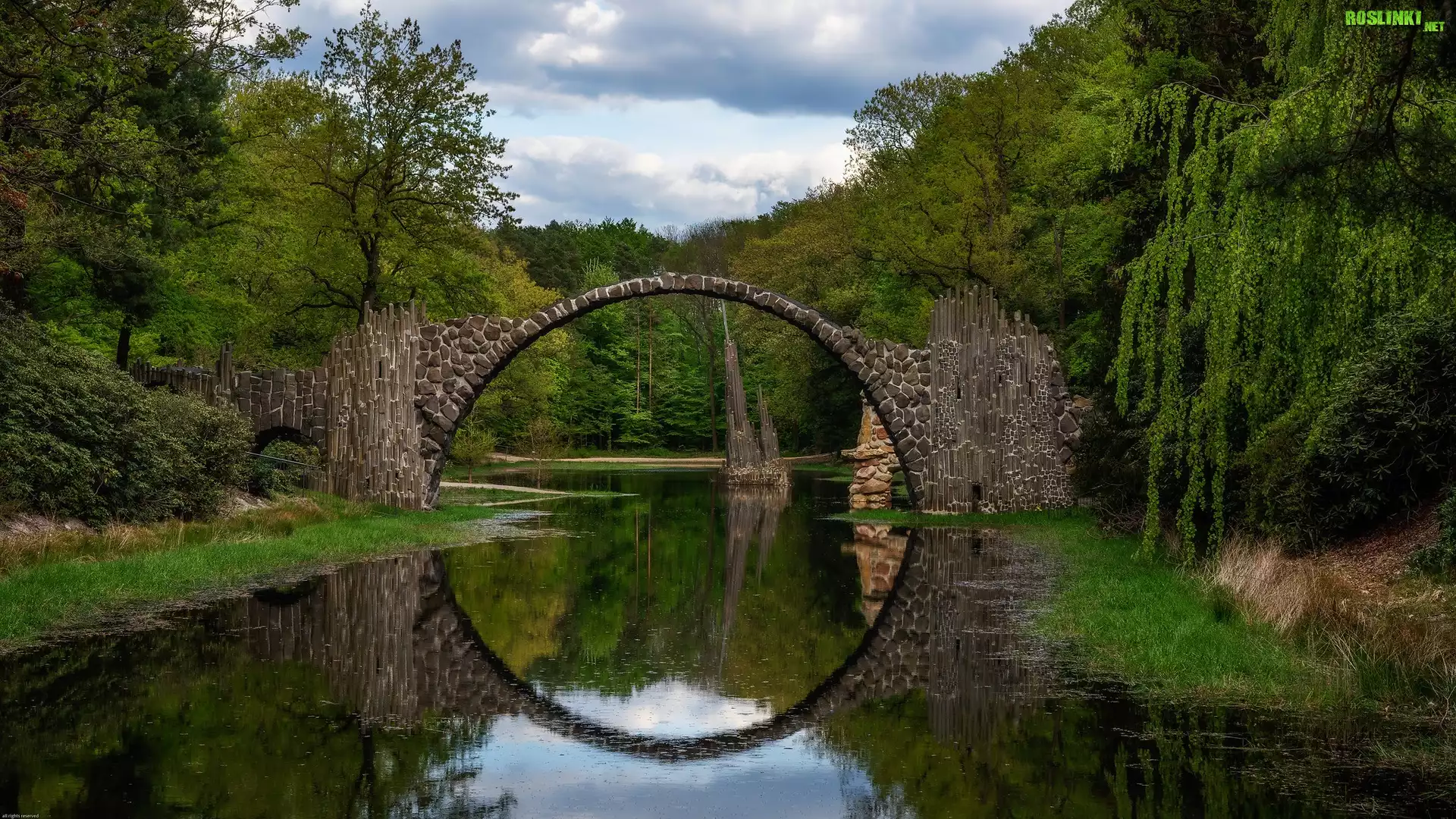 Rośliny: Niemcy, Saksonia, Park Rododendronów Kromlau, Kamienny, Most łukowy, Jezioro Rakotz, Drzewa, Chmury