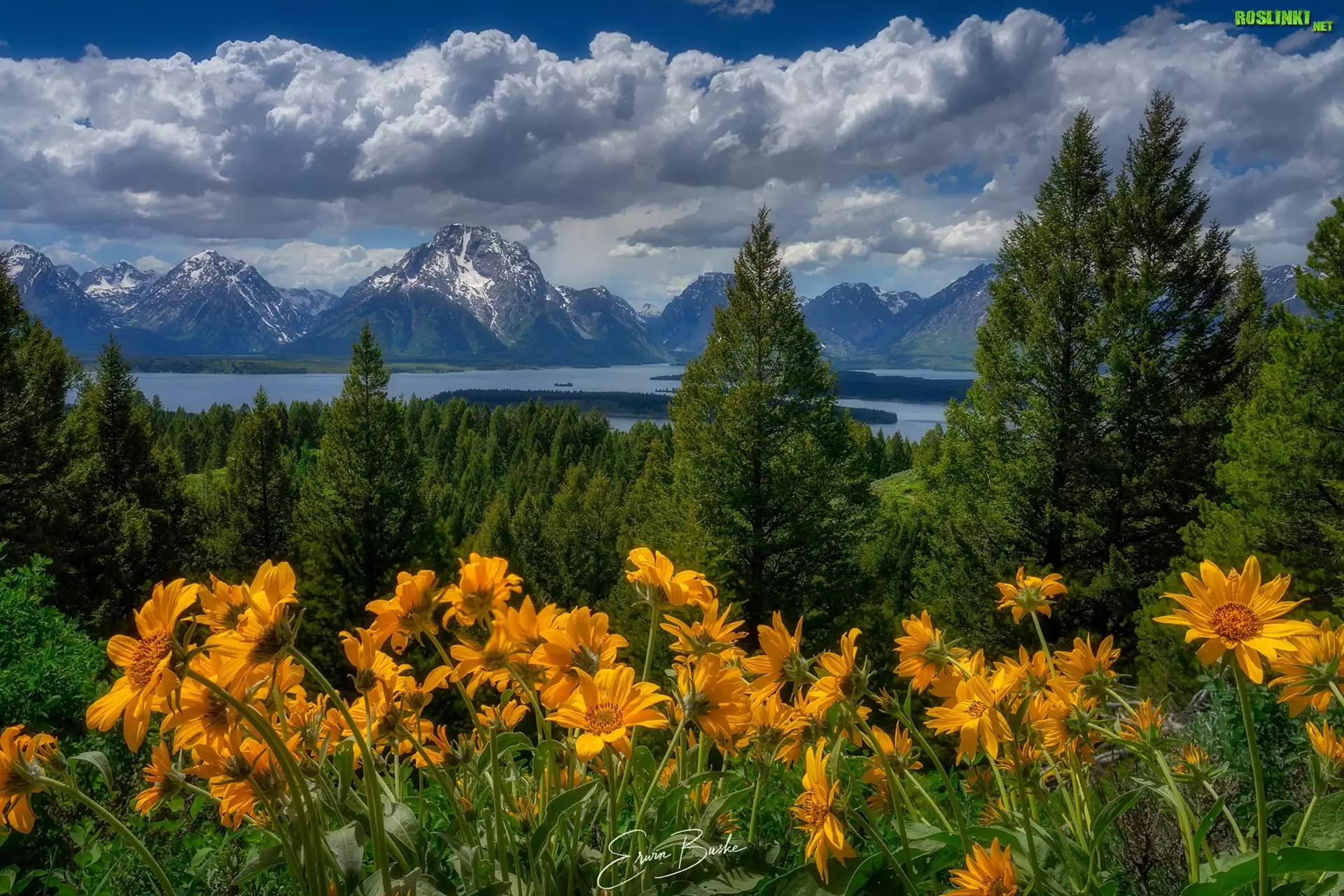 Rośliny: Stany Zjednoczone, Park Narodowy Grand Teton, Góry Teton Range, Drzewa, Las, Łąka, Kwiaty, Balsamorhiza