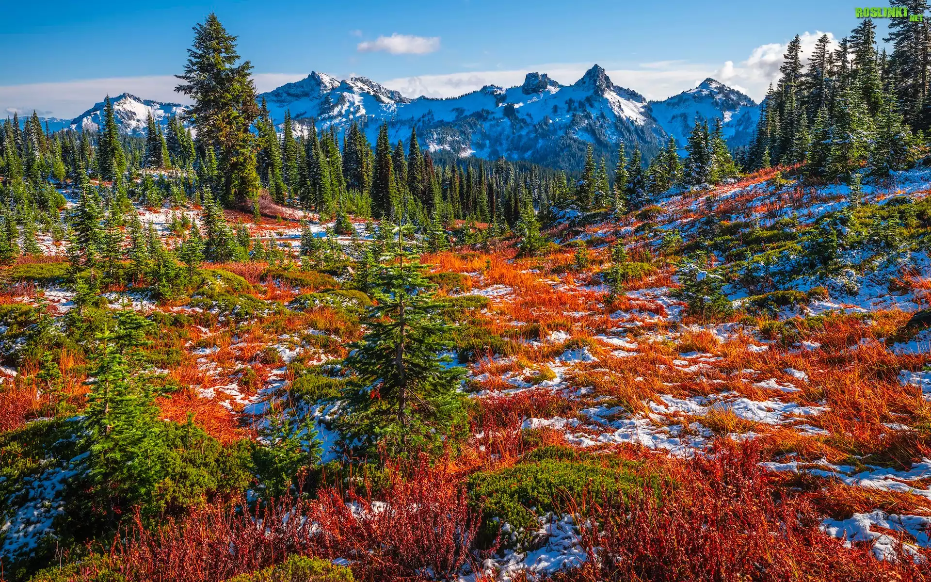 Park Narodowy Mount Rainier, Góry, Tatoosh Range, Łąka, Jesień, Roślinność, Drzewa, Śnieg, Stan Waszyngton, Stany Zjednoczone |