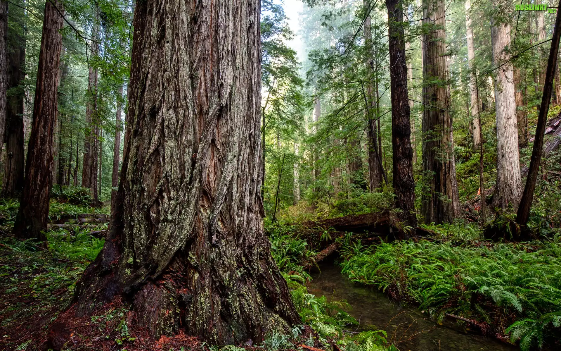 Las, Drzewa, Sekwoje, Paprocie, Park stanowy, Prairie Creek Redwood State Park, Kalifornia, Stany Zjednoczone |