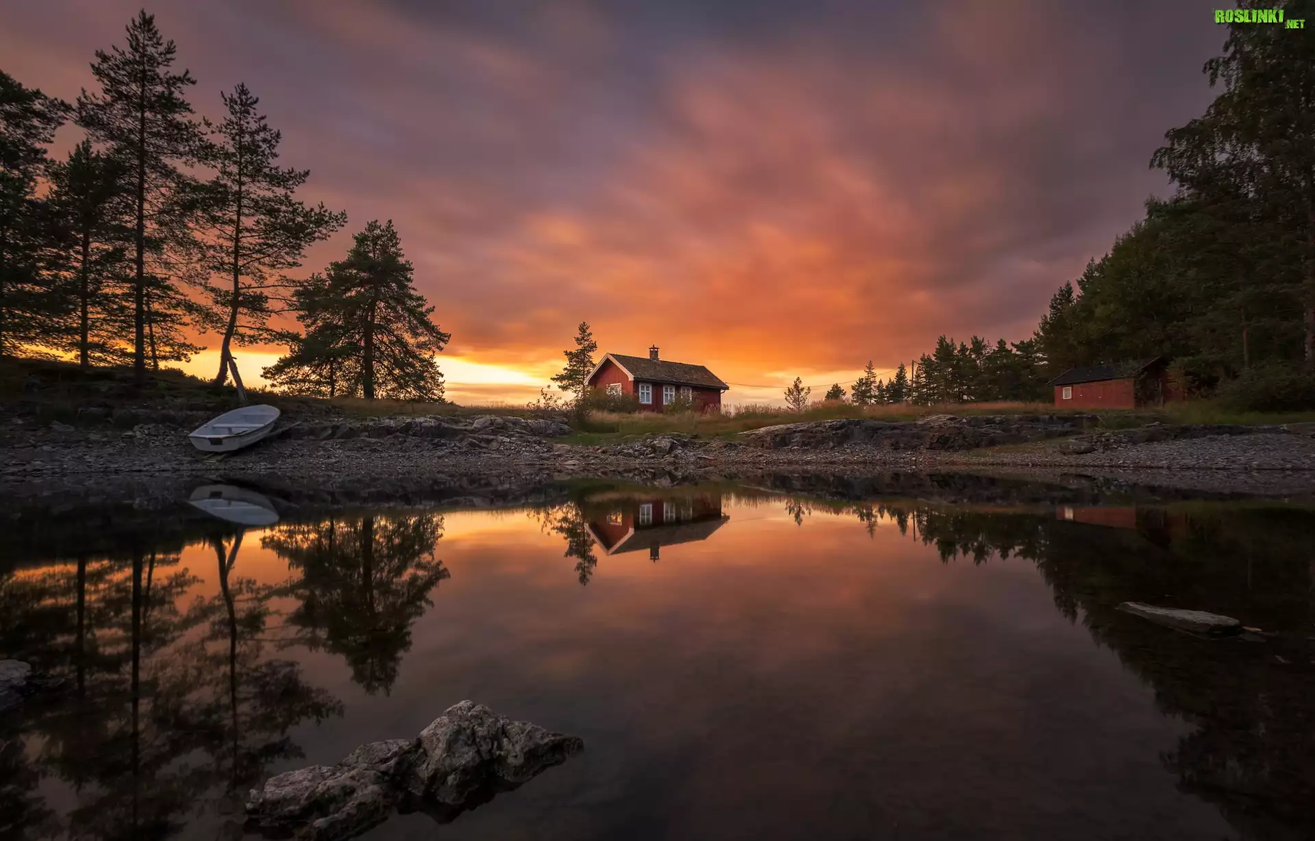 Rośliny: Norwegia, Ringerike, Jezioro, Zachód słońca, Drzewa, Dom, Łódka