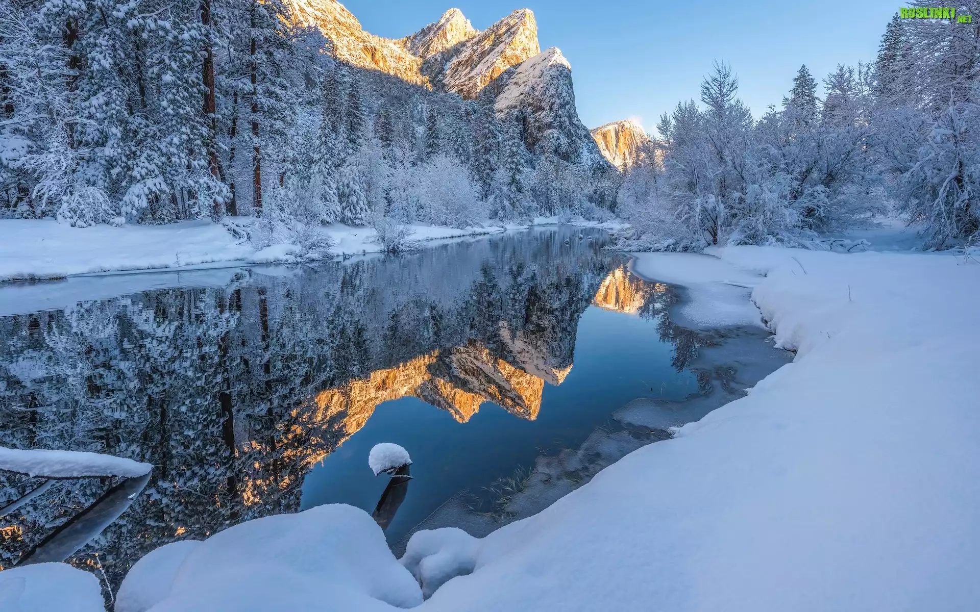 Rośliny: Stany Zjednoczone, Kalifornia, Park Narodowy Yosemite, Góry, Rzeka, Merced River, Zima, Drzewa