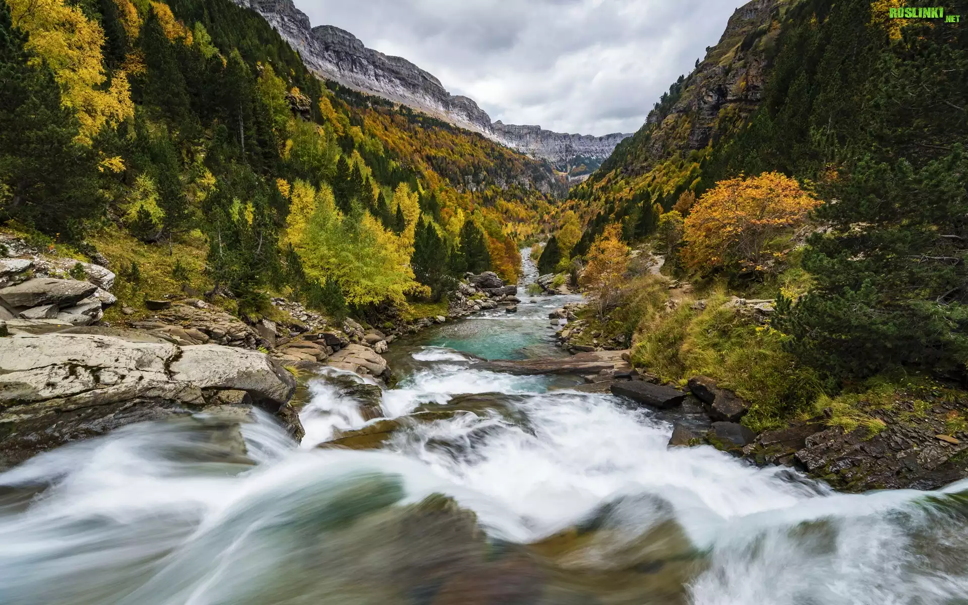 Rośliny: Rzeka, Arazas River, Drzewa, Kamienie, Góry, Pireneje, Jesień, Prowincja Huesca, Hiszpania