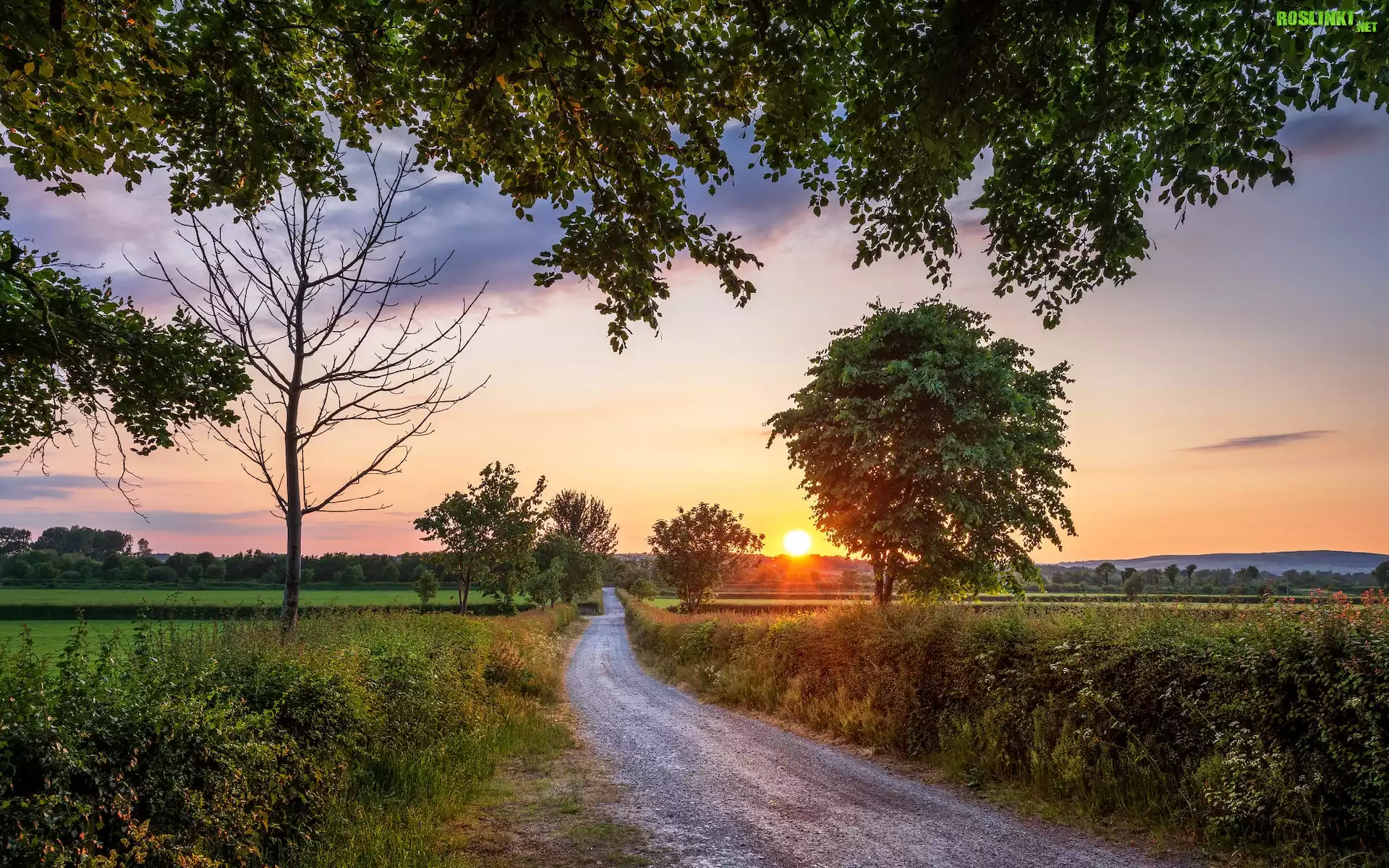 Rośliny: Irlandia, Hrabstwo Tyrone, Strabane, Droga, Park Road, Lato, Drzewa, Promienie słońca