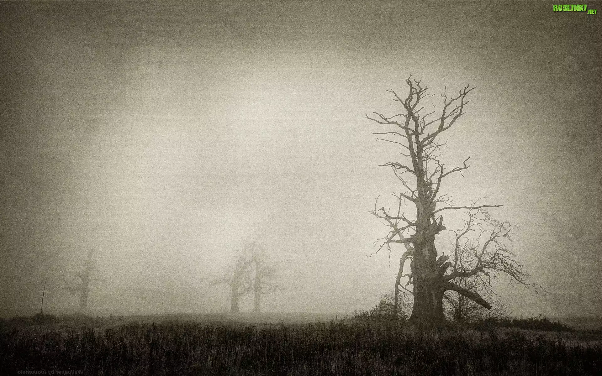 Rośliny: Rogalin, Dęby, Mgła, Stare zdjęcie