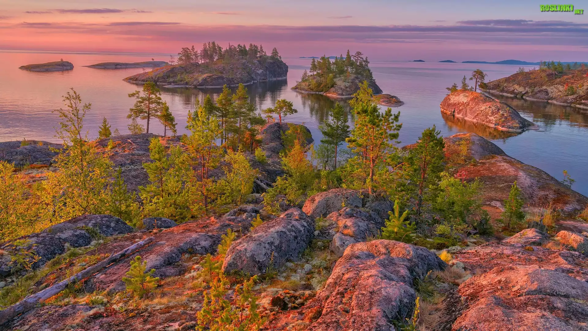 Rośliny: Rosja, Jezioro Ładoga, Wysepki, Skały, Drzewa, Roślinność, Karelia, Rosja
