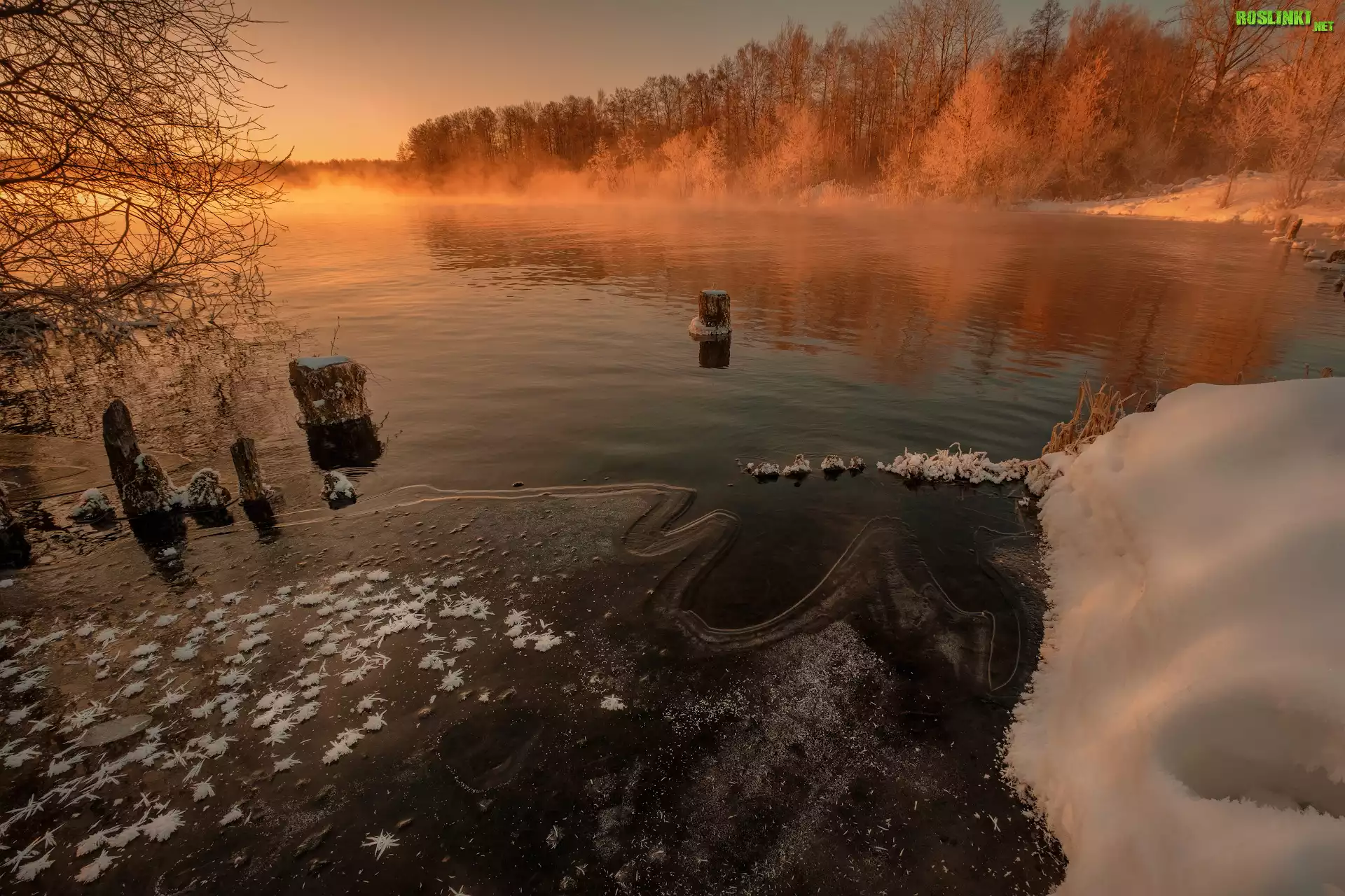 Rośliny: Zima, Jezioro Białe, Mgła, Drzewa, Kołki, Szatura, Obwód moskiewski, Rosja