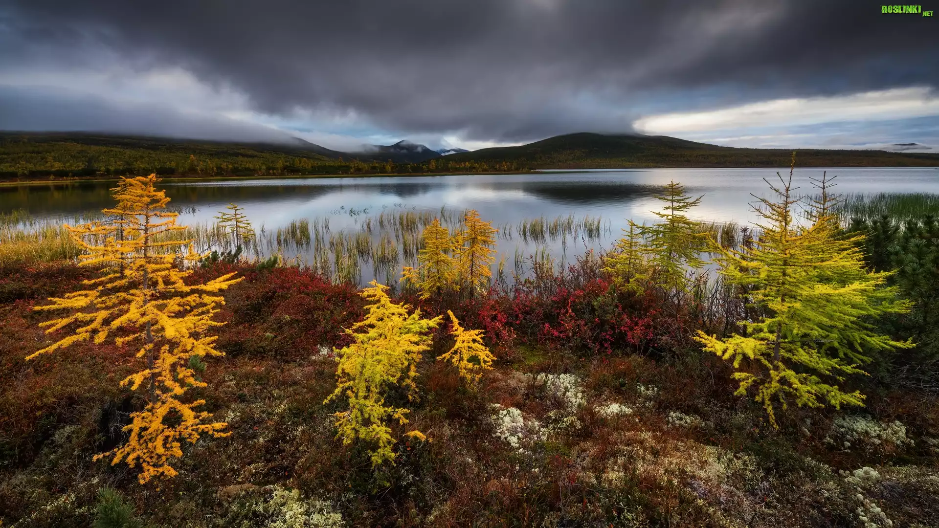 Rośliny: Rosja, Kołyma, Góry, Jezioro, Jacka Londona, Jesień, Chmury, Drzewa, Roślinność