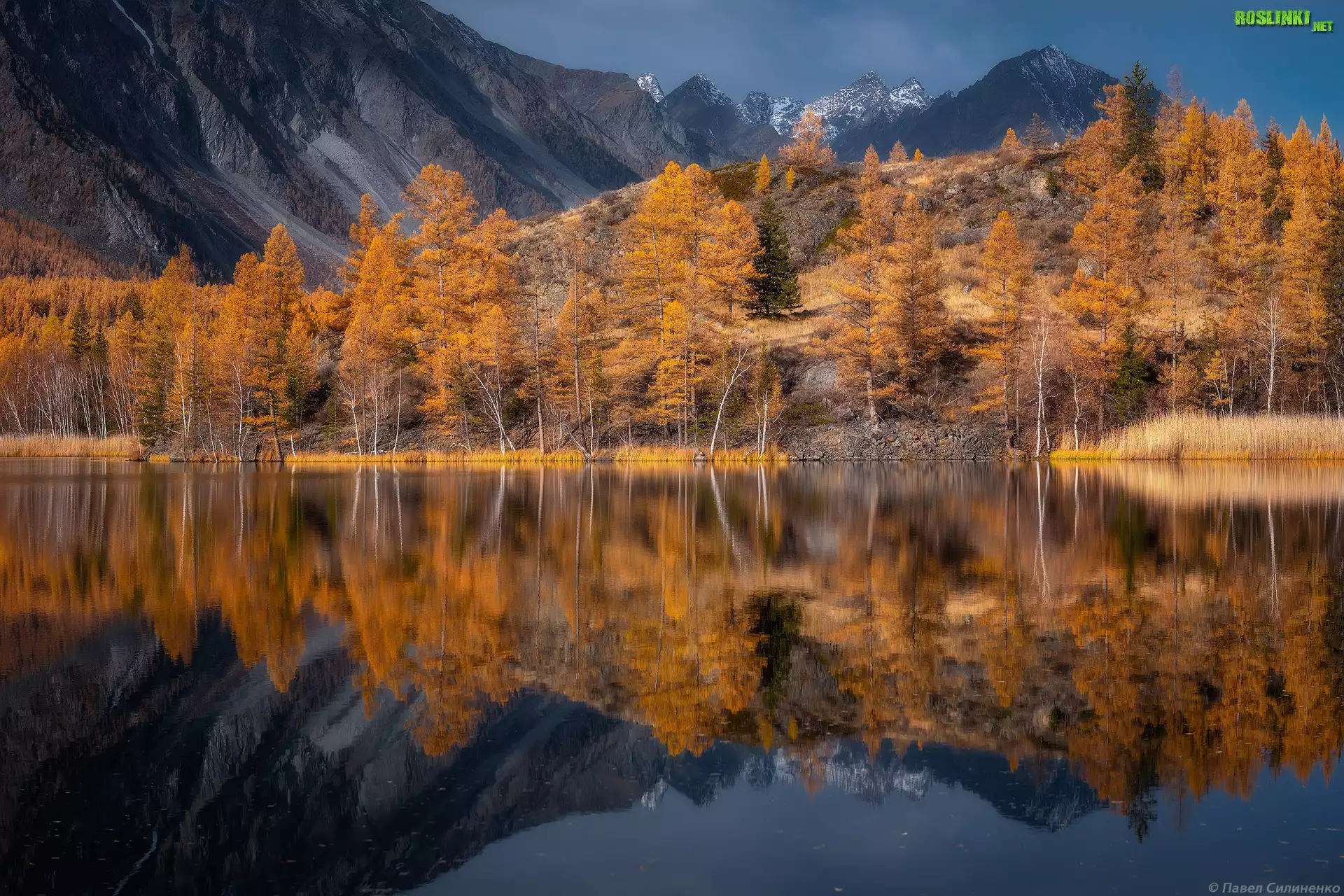 Rośliny: Jesień, Góry, Drzewa, Jezioro Kindyktykul, Odbicie, Republika Ałtaju, Rosja