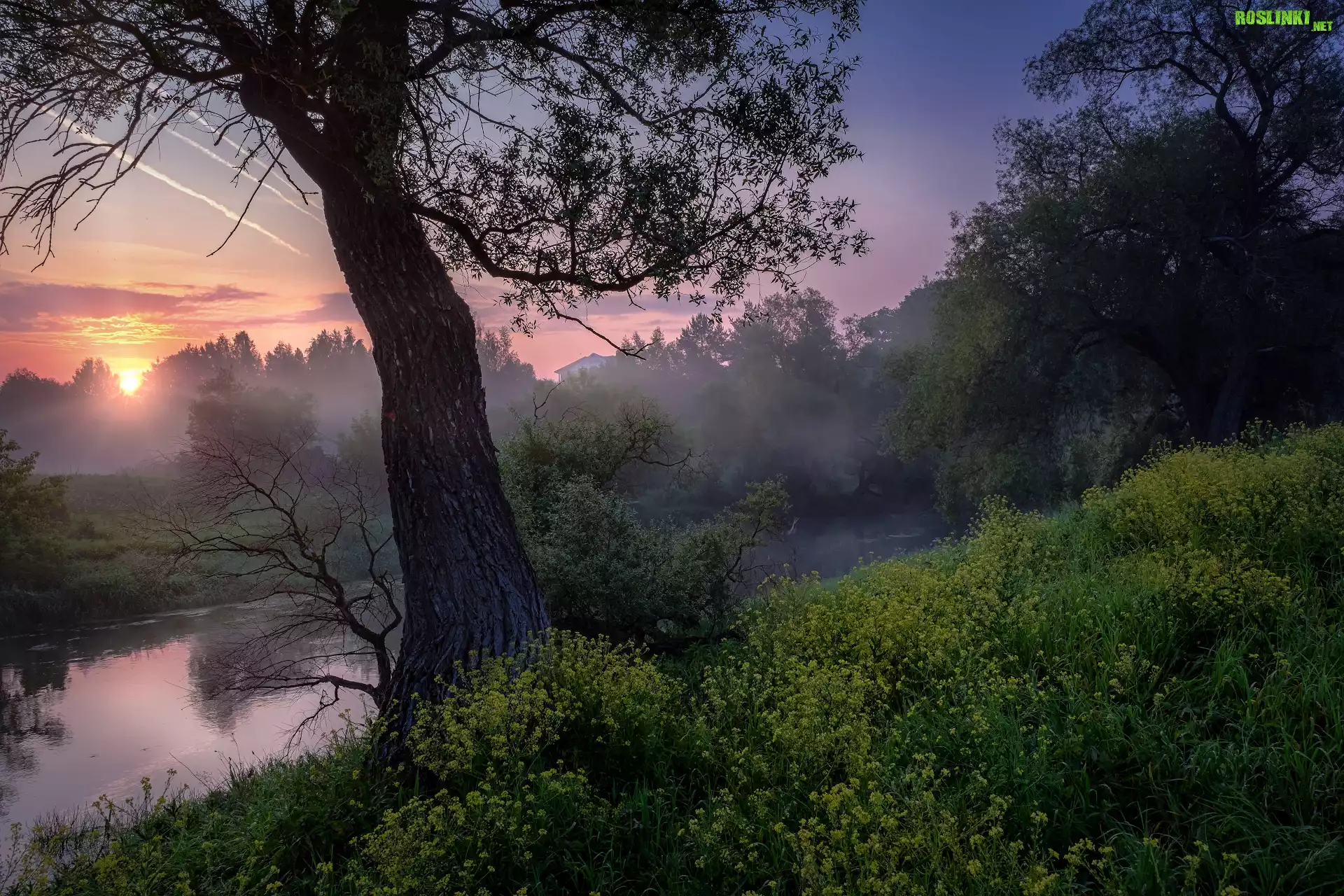 Rośliny: Rzeka Istra, Drzewa, Wschód słońca, Mgła, Obwód moskiewski, Rosja