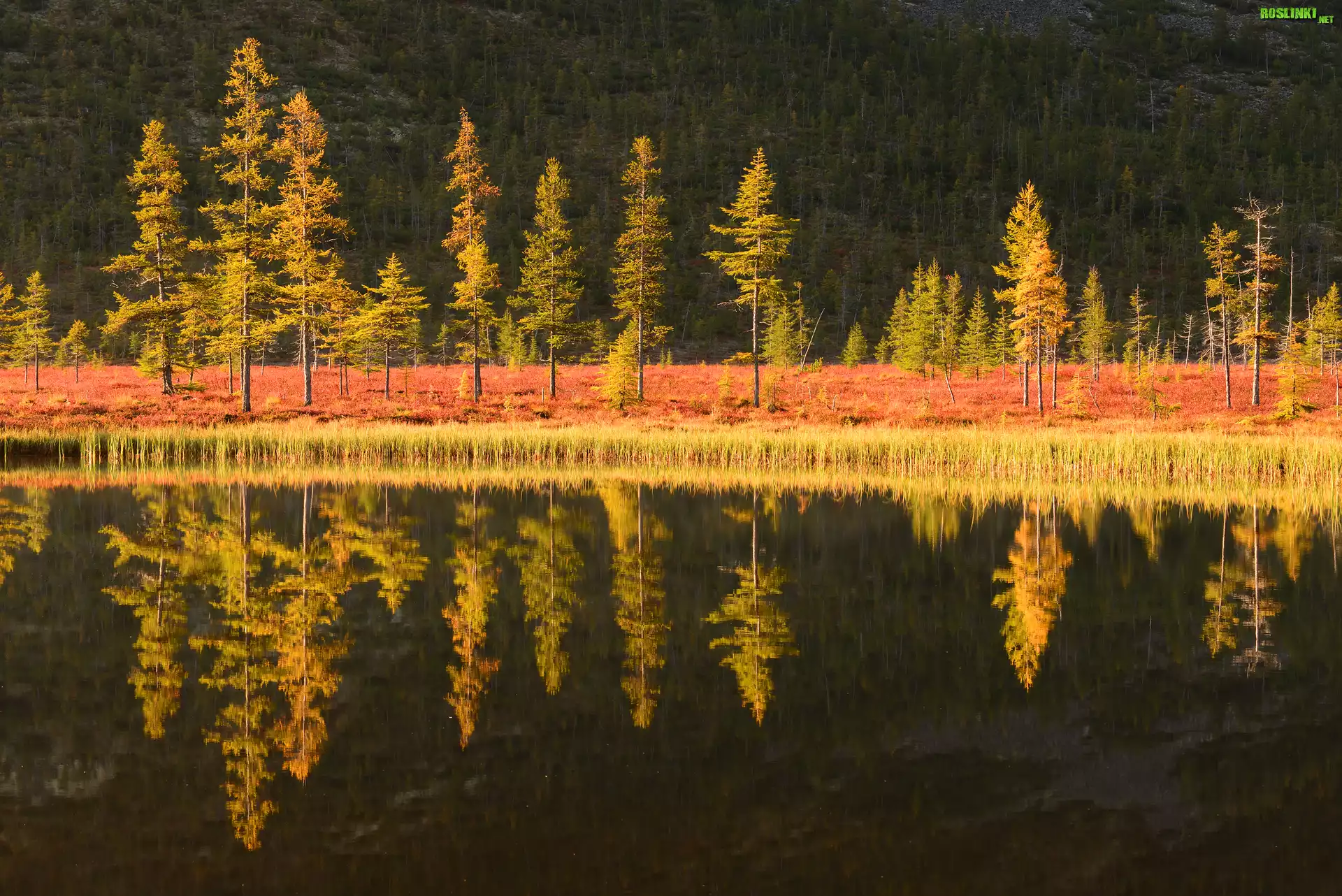 Rośliny: Jesień, Jezioro Jack London, Drzewa, Odbicie, Kołyma, Obwód magadański, Rosja