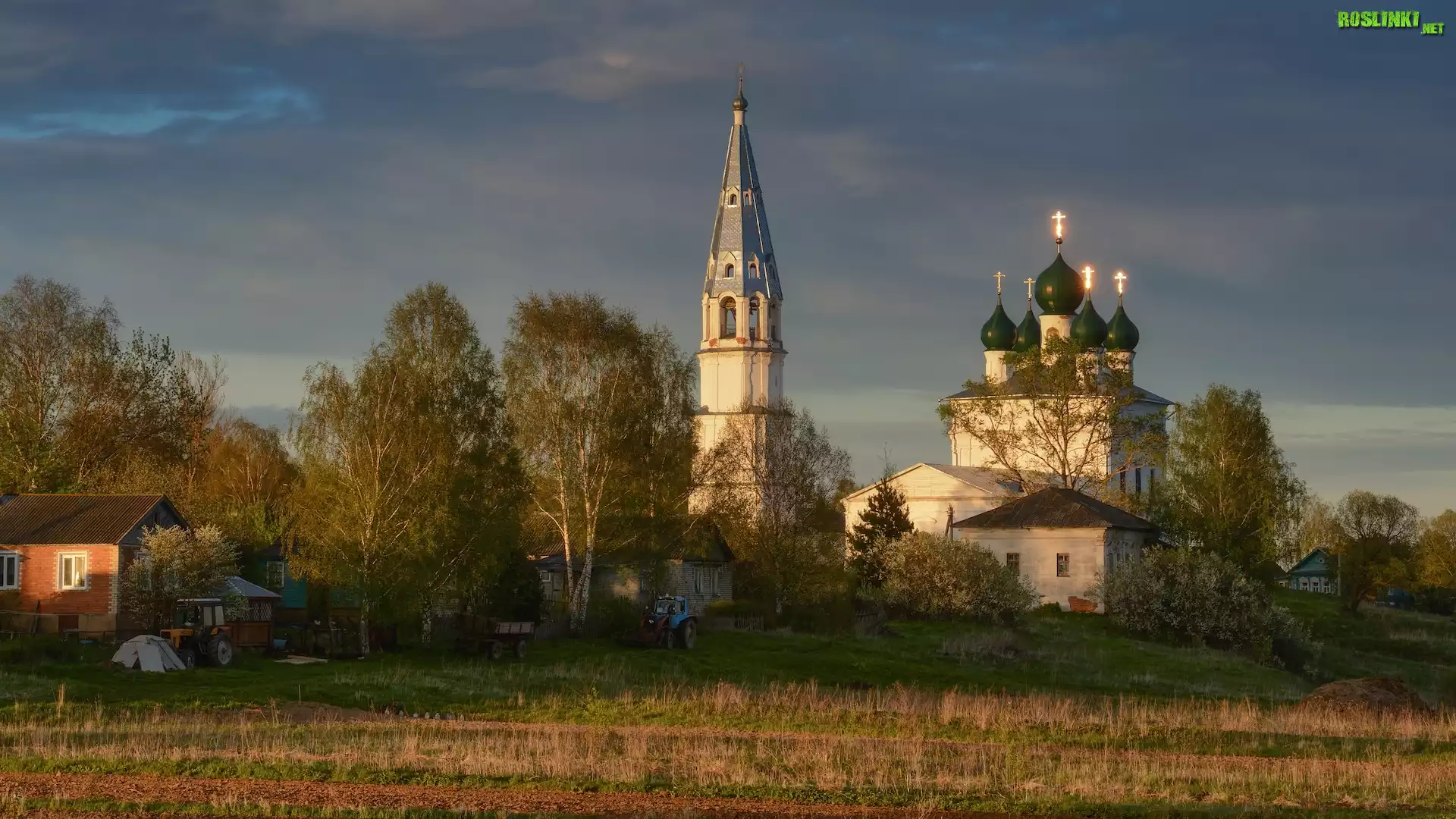 Rośliny: Cerkiew, Dzwonnica, Pole, Domy, Drzewa, Wieś Osenevo, Obwód jarosławski, Rosja