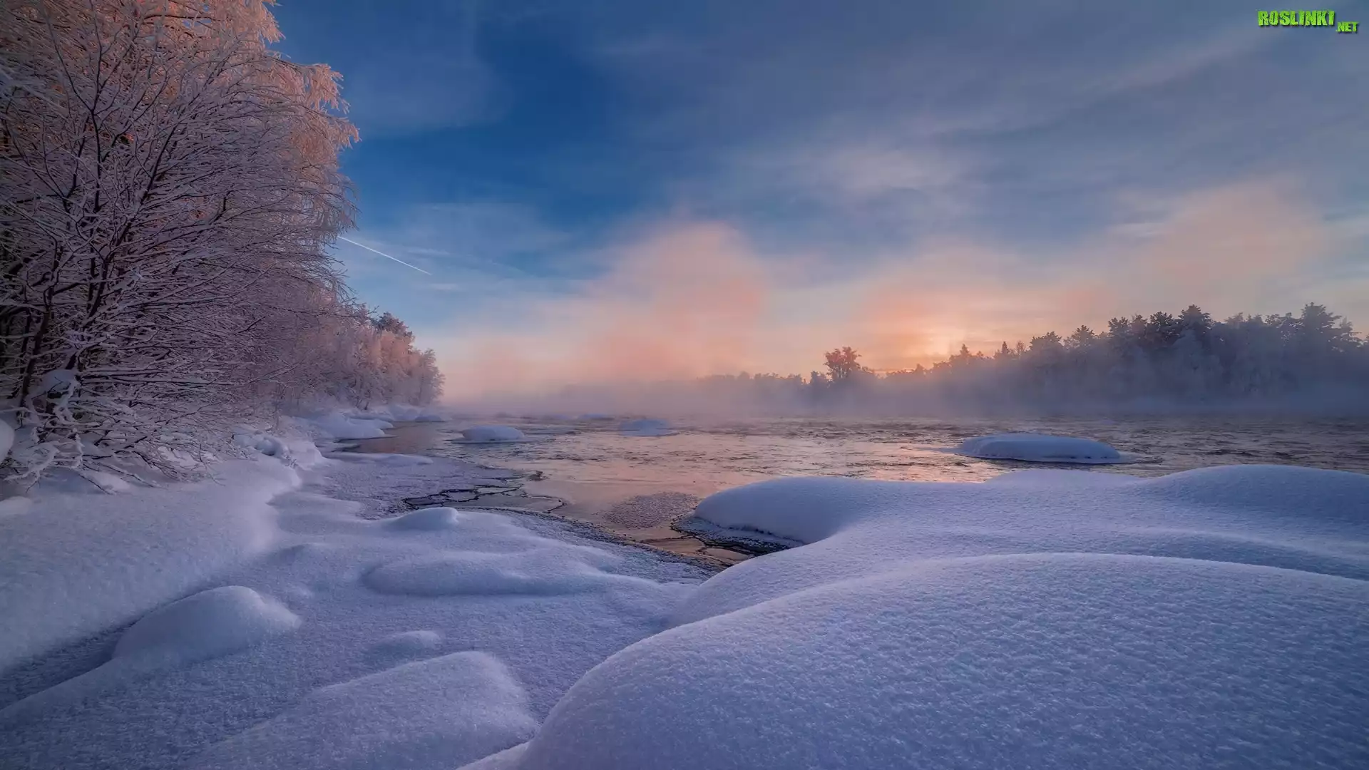 Rośliny: Zima, Mgła, Rzeka Pirenga, Drzewa, Półwysep Kolski, Obwód murmański, Rosja