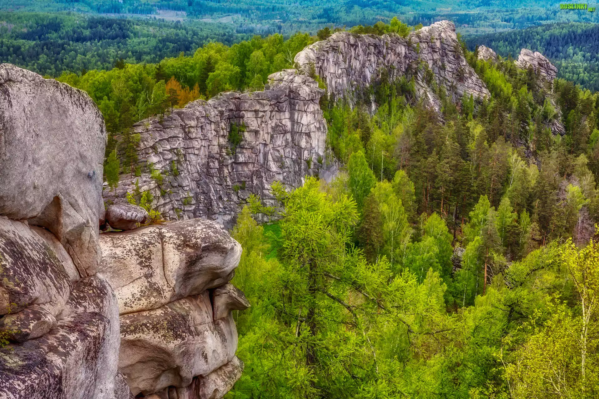 Góry, Skały, Drzewa, Południowy Ural, Arakul, Obwód czelabiński, Rosja