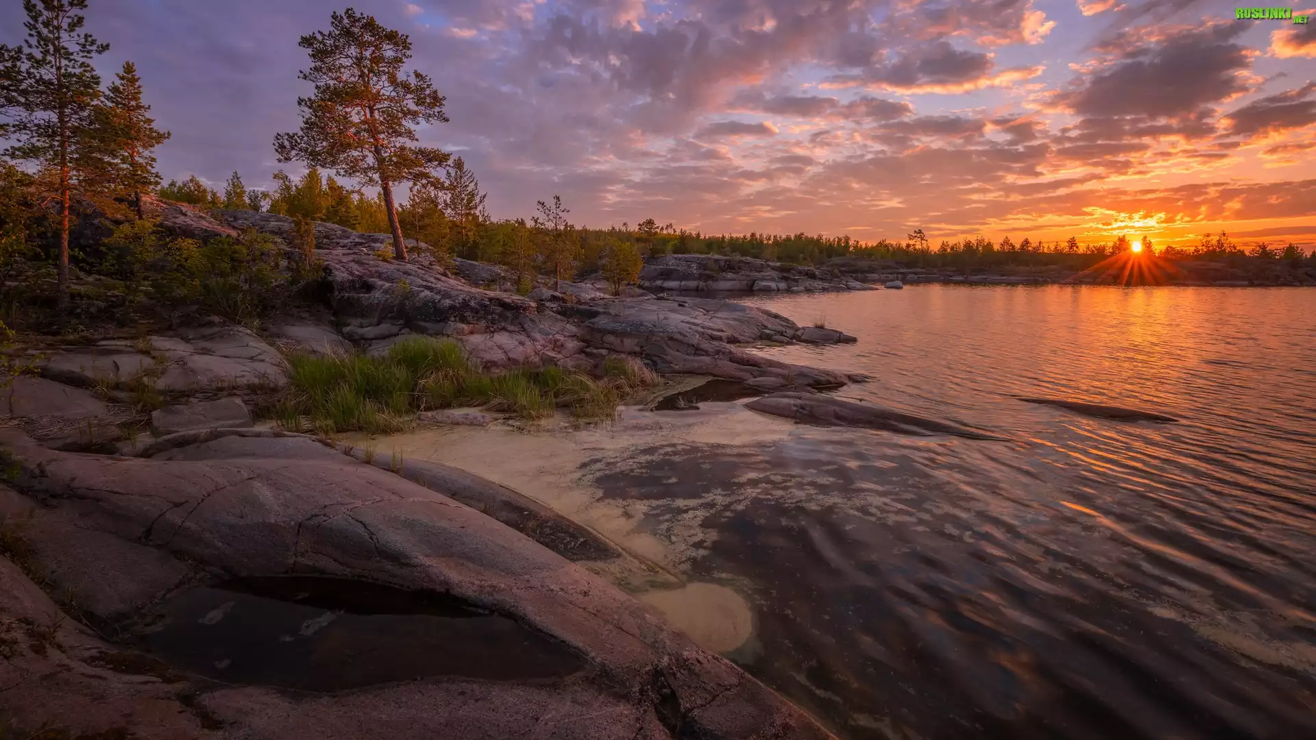 Rośliny: Rosja, Karelia, Jezioro, Ładoga, Promienie słońca, Drzewa, Jesień, Skały