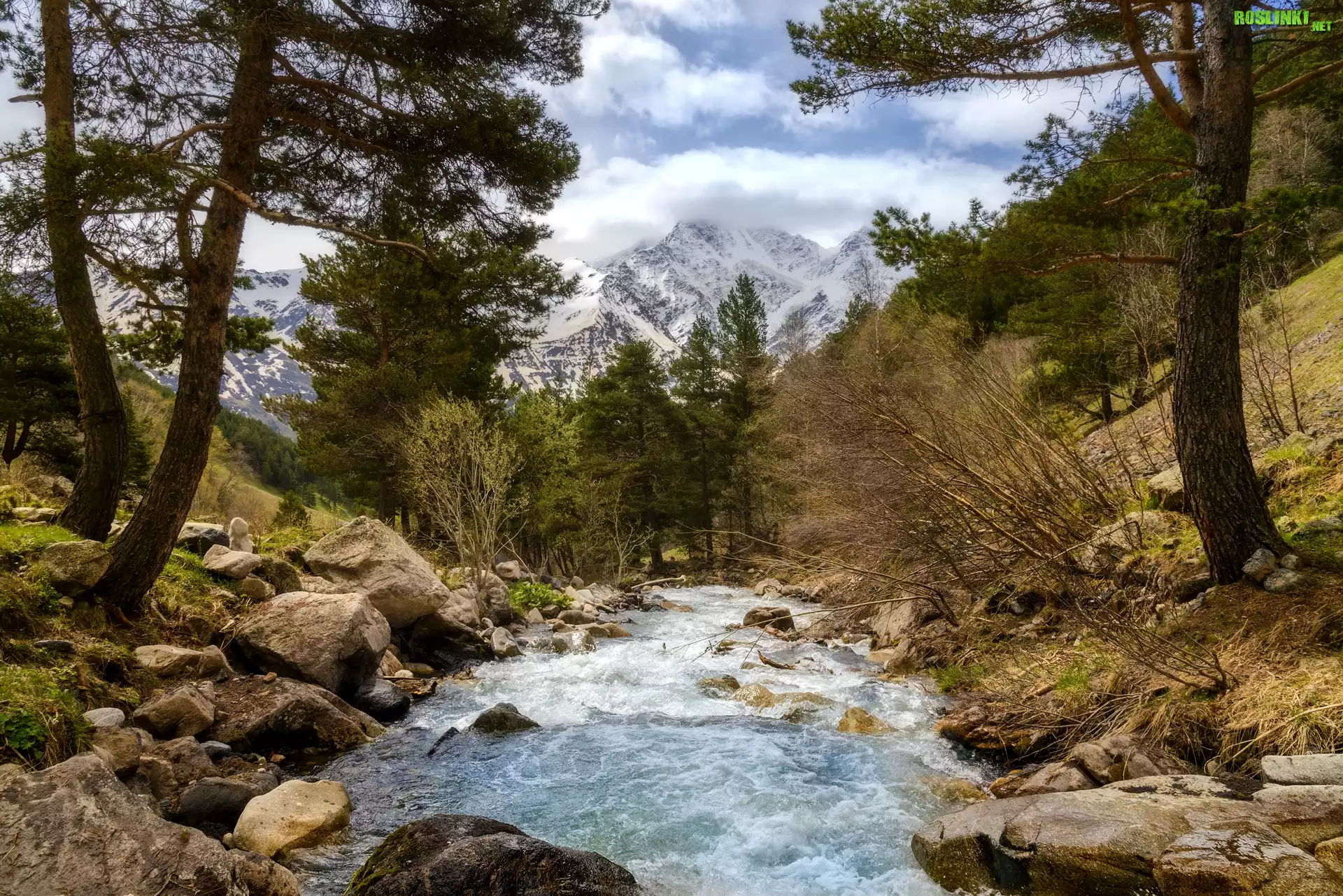 Rośliny: Drzewa, Rzeka Baksansky, Kamienie, Góry, Wąwóz Terskol, Kabardo-Bałkaria, Rosja