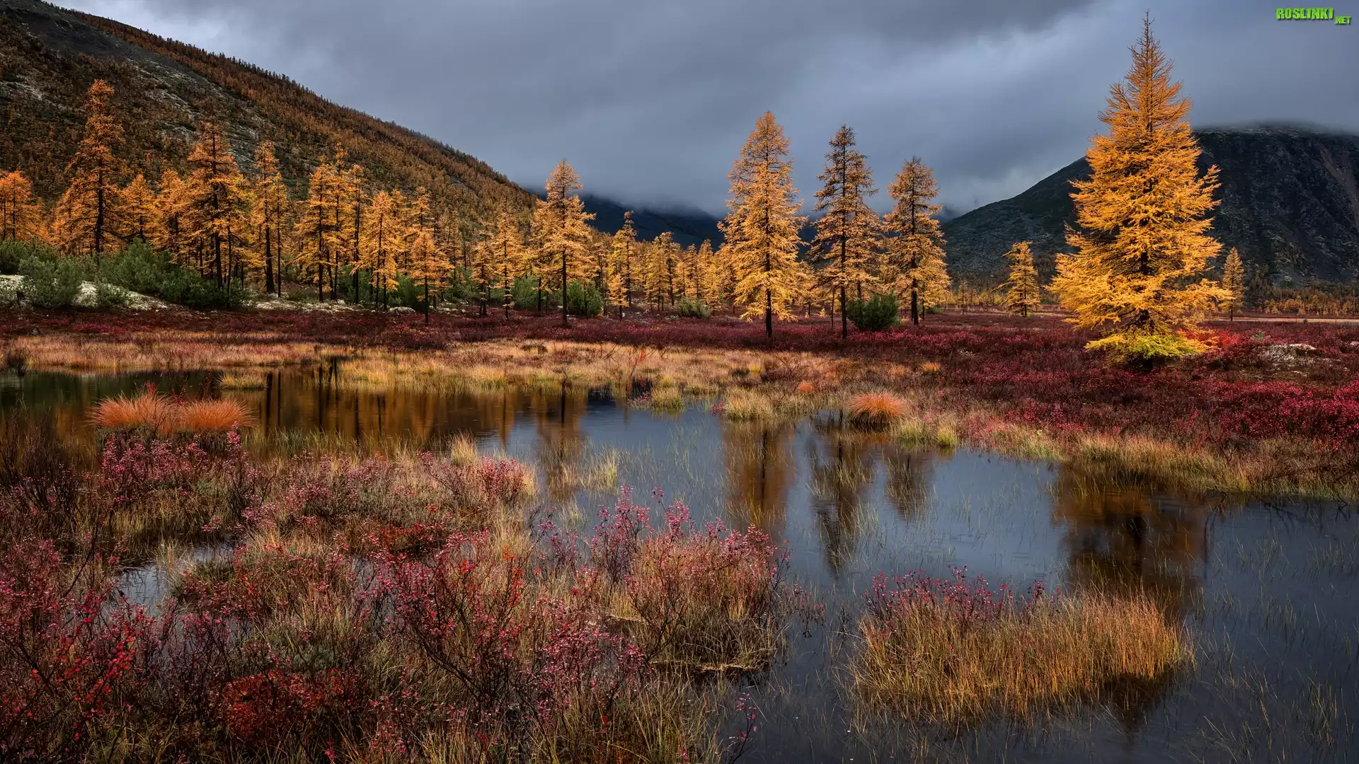 Rośliny: Rosja, Kołyma, Góry, Jezioro, Jacka Londona, Jesień, Drzewa, Krzewy