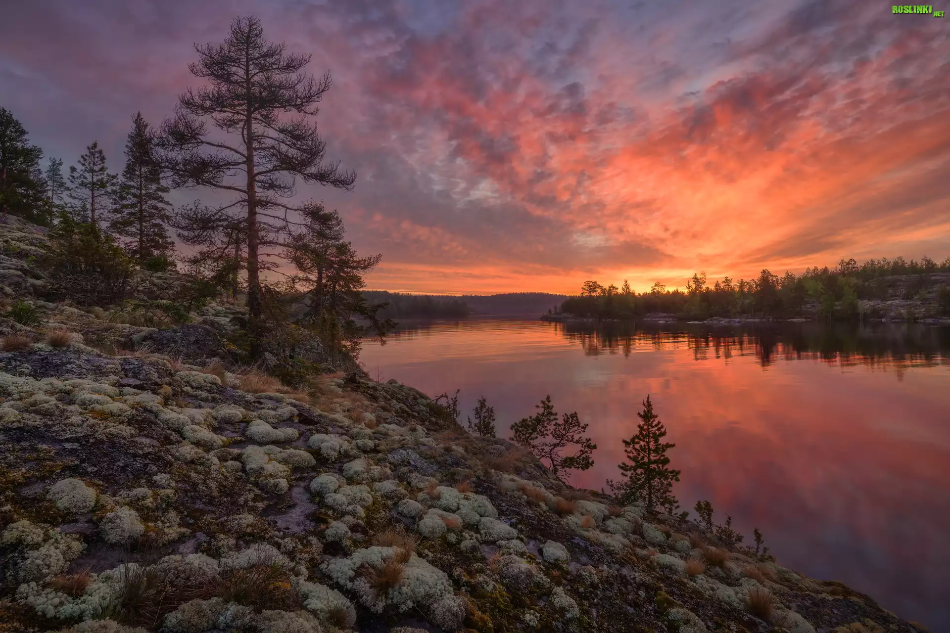 Rośliny: Zachód słońca, Jezioro, Ładoga, Kamienie, Drzewa, Karelia, Rosja