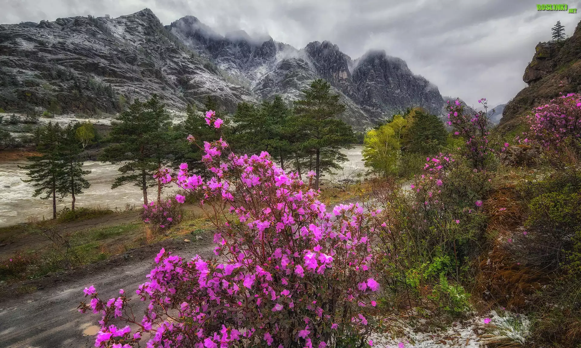 Rośliny: Góry Ałtaj, Skały, Rzeka Katun, Drzewa, Krzew, Różanecznik, Ałtaj, Rosja