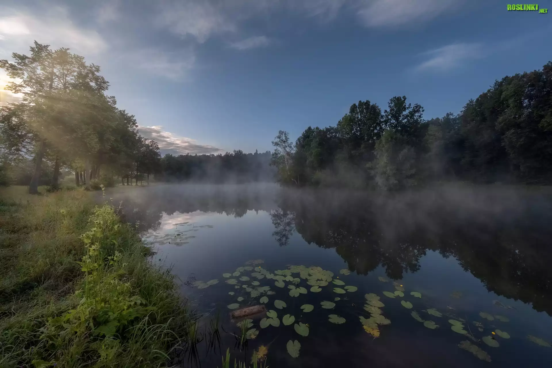 Rośliny: Staw Barski, Mgła, Drzewa, Odbicie, Serednikowo, Obwód moskiewski, Rosja
