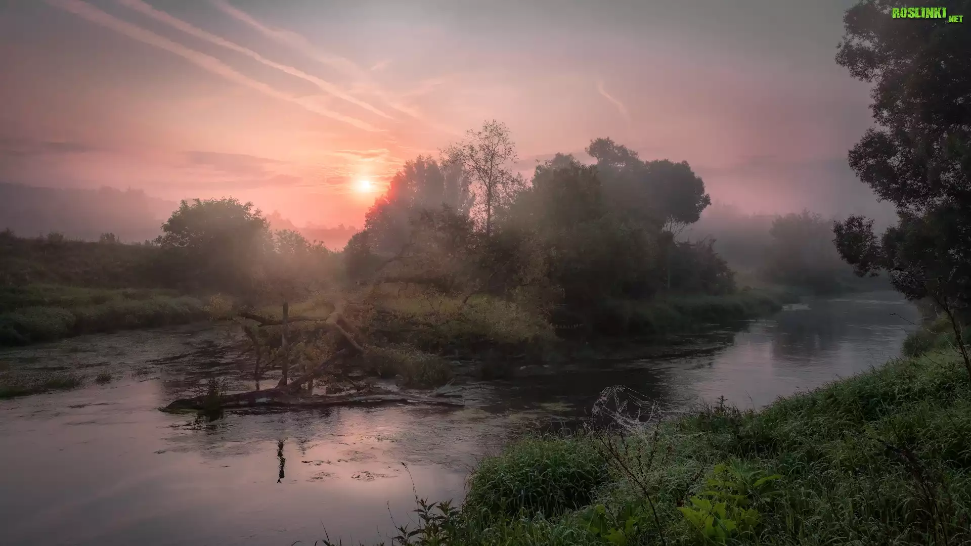 Rośliny: Wschód słońca, Mgła, Drzewa, Rzeka Istra, Obwód moskiewski, Rosja