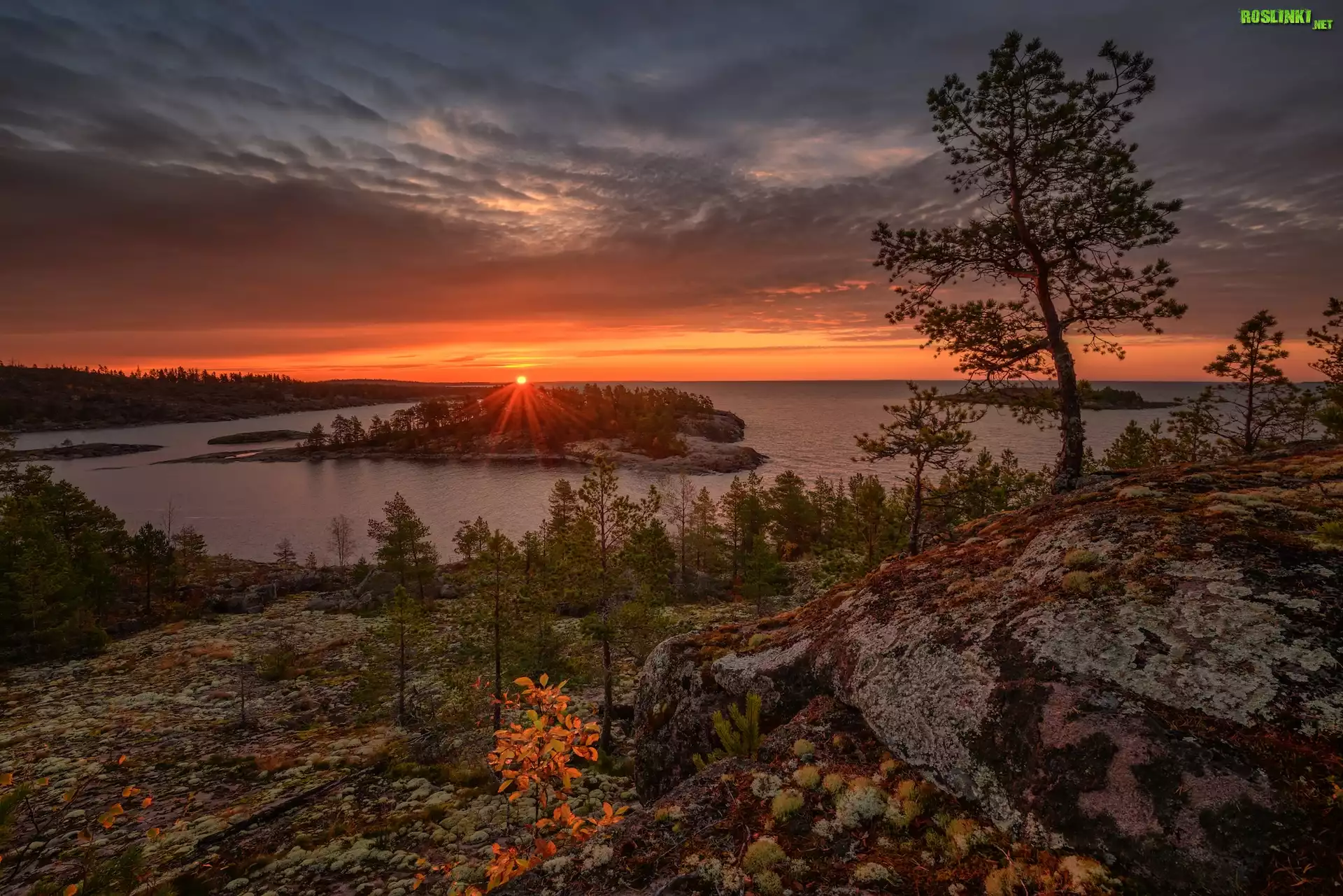 Rośliny: Rosja, Karelia, Jezioro, Ładoga, Skały, Drzewa, Niebo, Zachód słońca