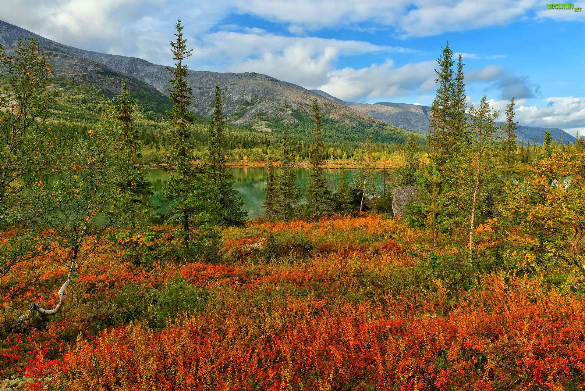 Rośliny: Las, Drzewa, Jezioro, Chmury, Niebo, Góry Chibiny, Półwysep Kolski, Rosja