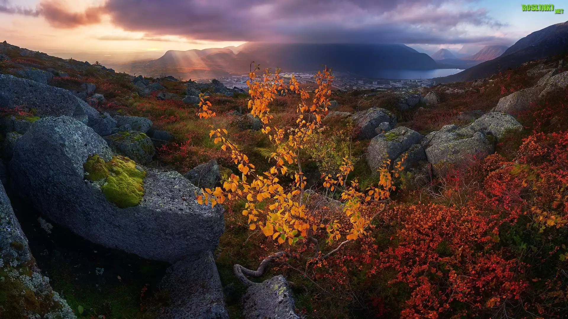 Rosja, Półwysep Kolski, Obwód murmański, Góry Chibiny, Jezioro, Kolorowe, Rośliny, Krzew, Kamienie, Jesień |