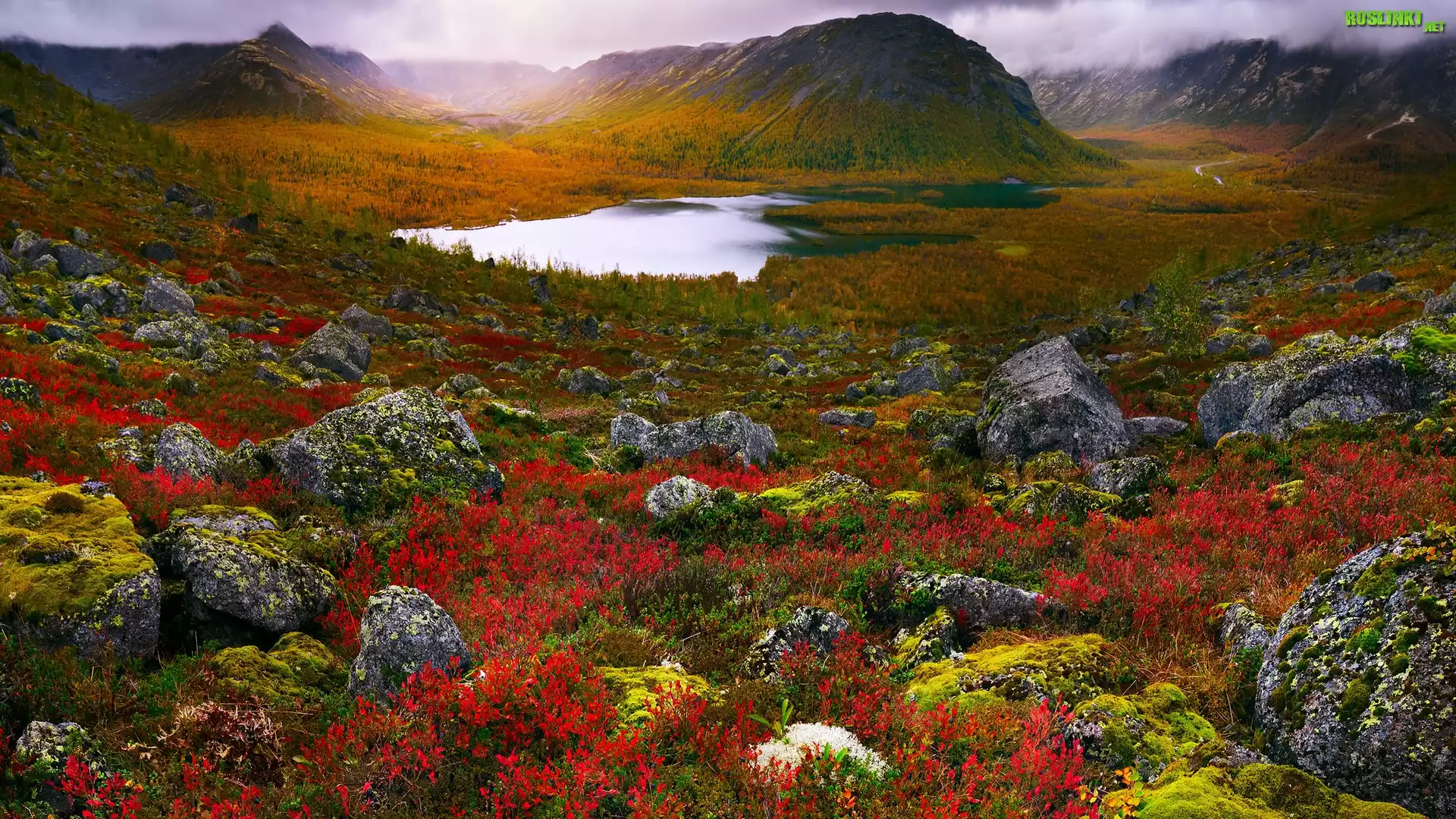 Rosja, Półwysep Kolski, Obwód murmański, Góry Chibiny, Jezioro, Kolorowe, Rośliny, Kamienie, Mgła, Tundra |